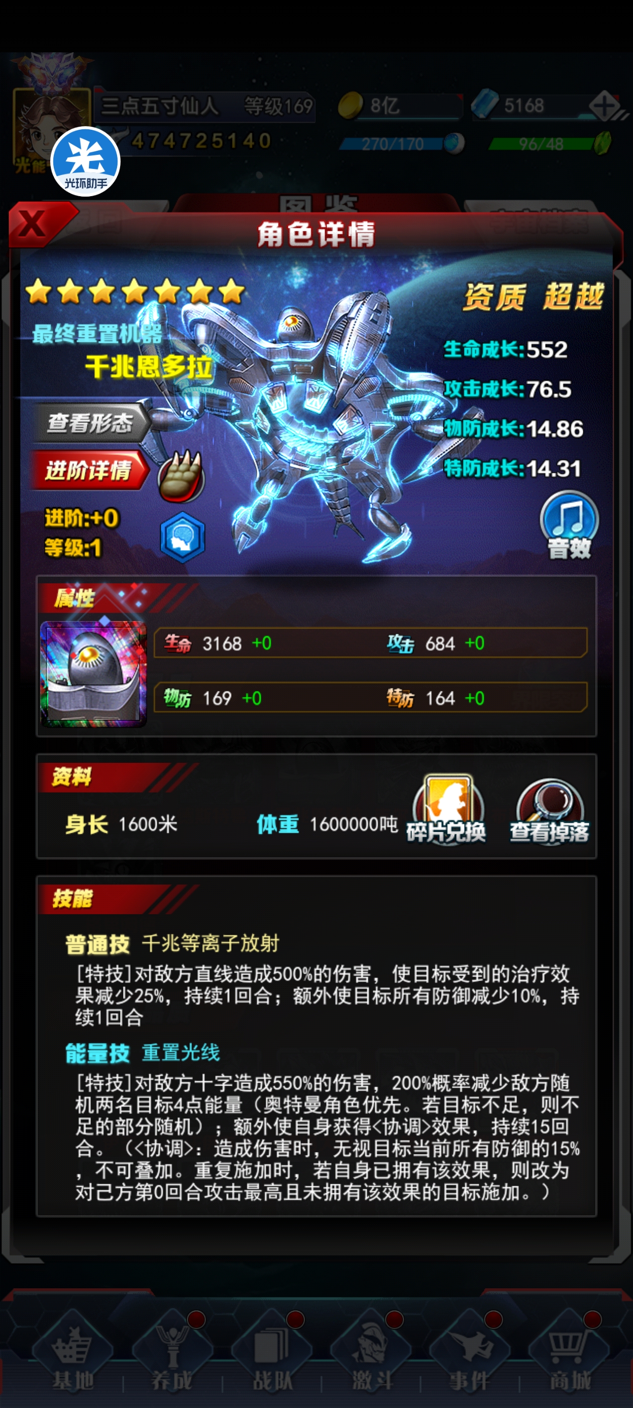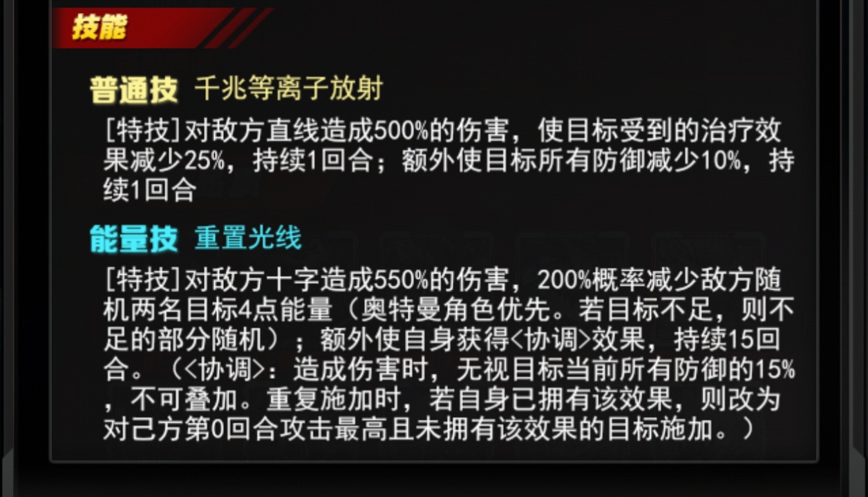 1.有200%概率减少敌方随机两名目标4点能量(奥特曼角色优先。若目标不足,则不足的部分随机)。削减敌方能量可以打乱敌方的技能释放节奏,尤其是优先针对奥特曼角色这种特殊设定,可能是在游戏设定中奥特曼角色的能量技能比较强力。