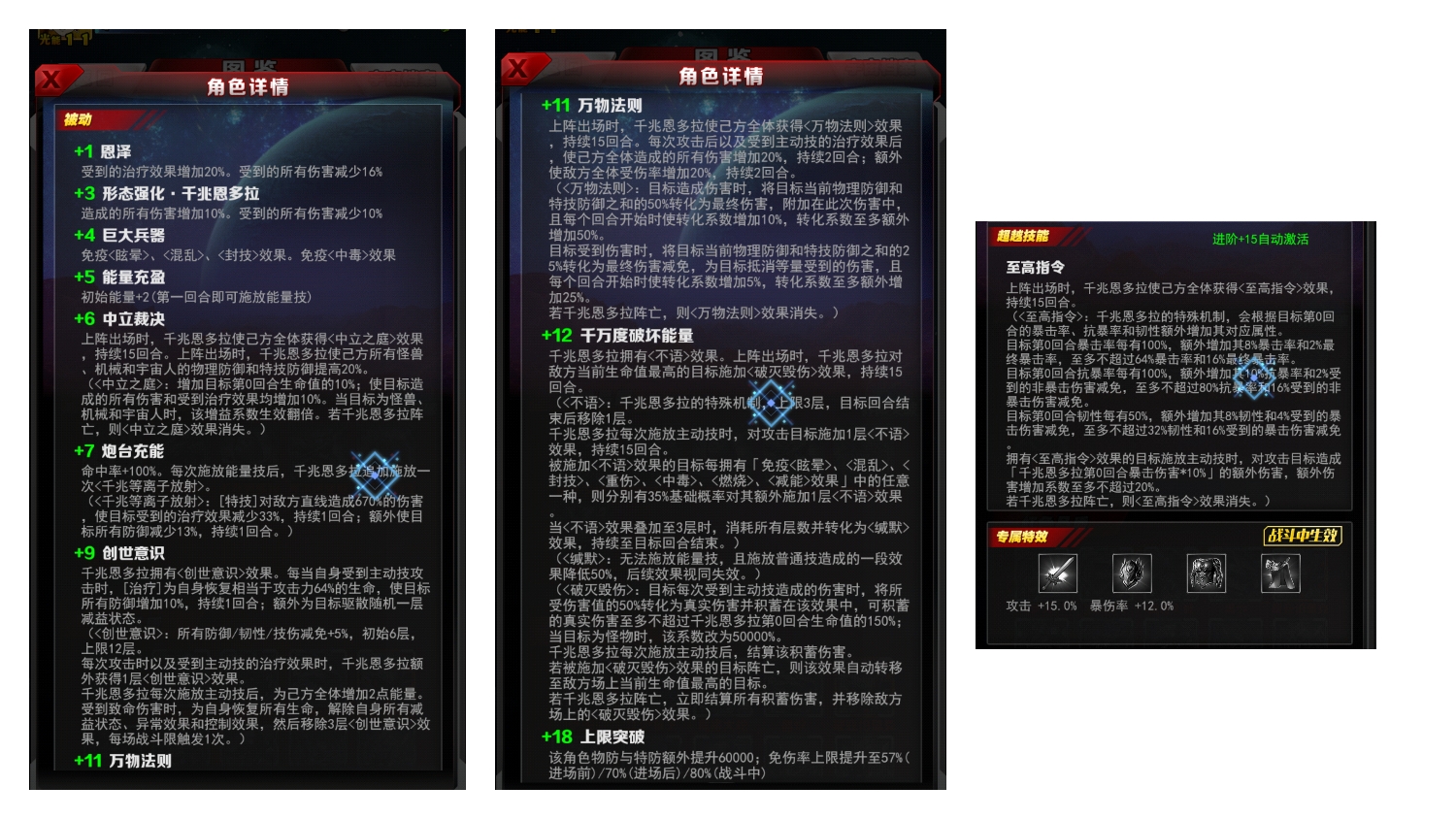 千兆恩多拉的被动技能涵盖了多个方面的增益效果。包括自身的伤害输出提升、防御增强、治疗效果增加、多种负面状态免疫等,同时还为己方全体提供了如<中立之庭>、<万物法则>、<至高指令>等多种强大的团队增益效果,并且在受到致命伤害时有特殊的自救机制。这些被动技能相互配合,使千兆恩多拉在战斗中既能保证自身的生存和输出,又能为团队带来极大的助力,并且很多效果与角色的存活状态相关,一旦阵亡会导致部分效果消失。