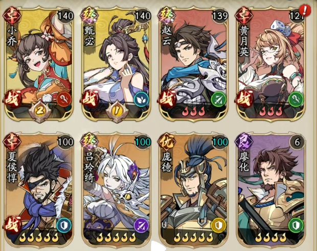 这个游戏它是三国题材的,阵营分魏蜀吴,然后还有一个神魔,神魔基本上都是一些群雄类的武将。玩过卡牌的其实都知道,神魔光暗这种特殊属性的,基本上后期都是会更厉害一点。前期开荒推荐大家的阵容就是混搭。我现在所使用的阵容也是系统推荐的,小乔、甄姬、赵云、黄月英跟夏侯惇。