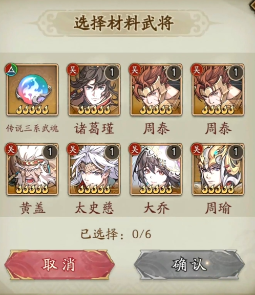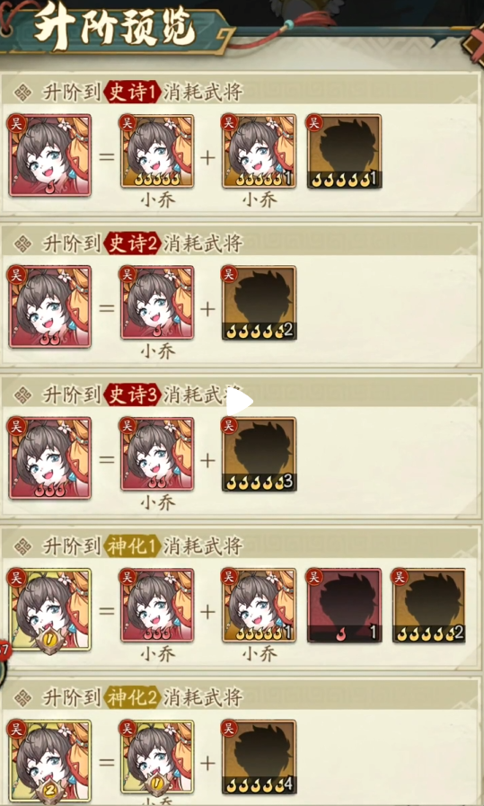 还有就是不同阶段的时候,需要消耗到本体进阶。比如你五星正常的橙卡进阶到红色是需要一个本体,加上别的吴国卡。神话你要进阶为神话一,也是需要一个本体的卡加上别的同国的卡。
