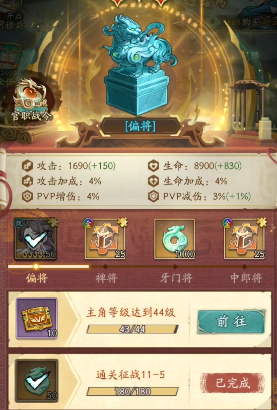 游戏的推图基本上以自动放置为主。第一天的肝度会稍微高一点,一堆红点需要清,第二天基本上就轻松一点了。这个游戏是会卡等级的,第一天零氪、包括首充党大概的等级会在40左右,第二天最多44、45这样子。包括一些玩法,也是根据等级来开的。还有就是前面推荐大家混搭的另一个原因,就是他会送你这个官职,官职会送一些至臻的卡,都是比较难抽出来的。然后包括有一些英雄传记给的也都是比较散的卡,每个国家都有。所以你如果玩这种三国混搭的这种阵容,就不太容易有资源的浪费。