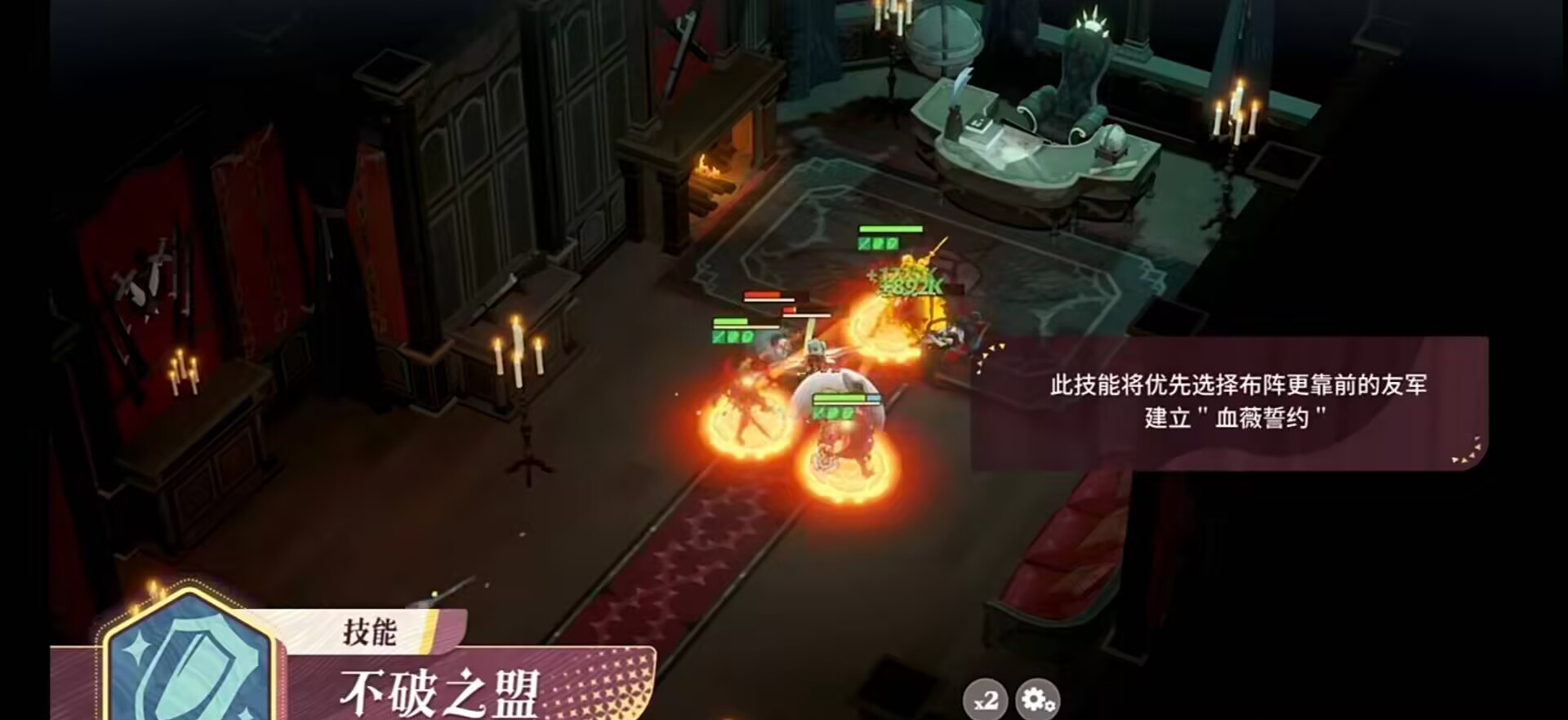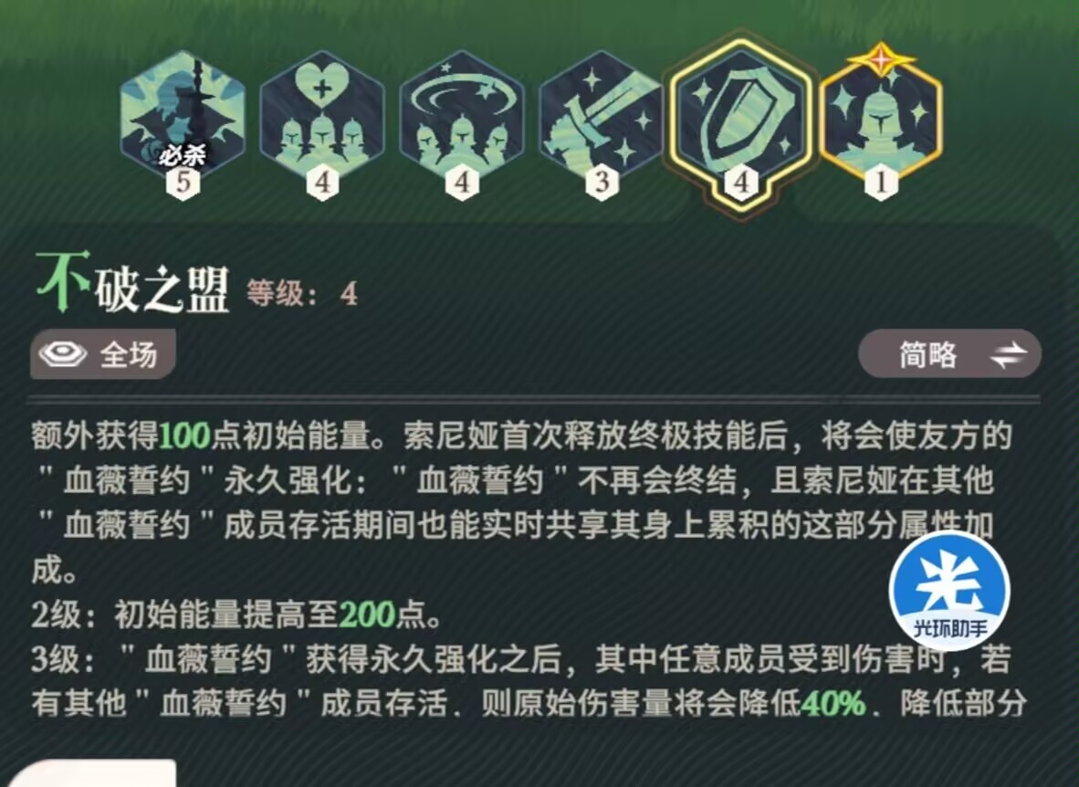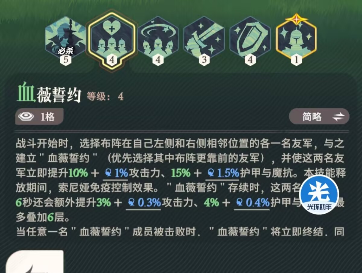 改变索妮娅一技能【血薇誓约】强化机制的核心专属技能,前面也说了被索妮娅一技能强化过的2名角色,其中任何一个角色在死亡后就会失去强化效果,并把这个强化攻击和防御的效果转移到索妮娅身上。
