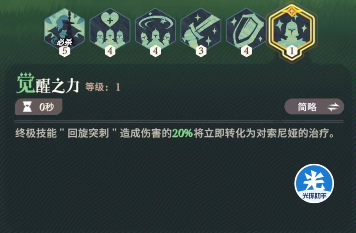 觉醒之力让大招造成的伤害有转换治疗的能力!大招造成的伤害有20%可以转换为对索妮娅的治疗,算是加强索妮娅的生存坦度吧!