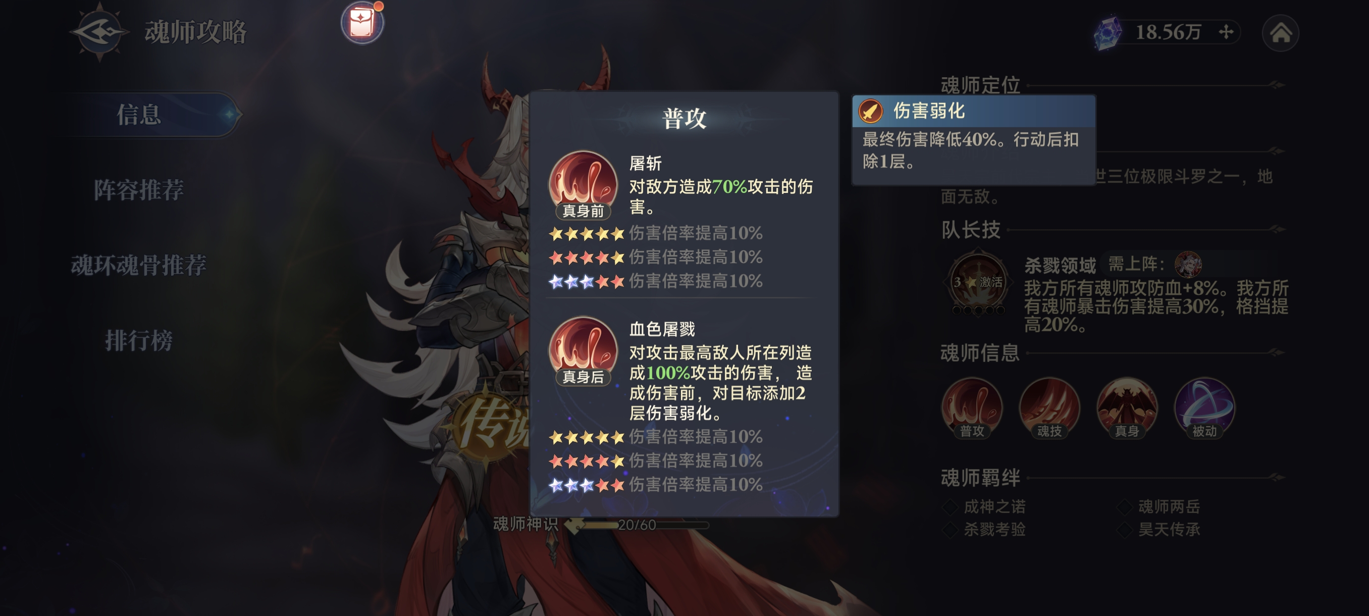 3星,开场对敌方全体附加1层【抵挡增益】,并且杀戮之王每次为敌方附加减益时,都会使敌方全体伤害永久降低10%,受伤永久增加5%,最多触发4次。