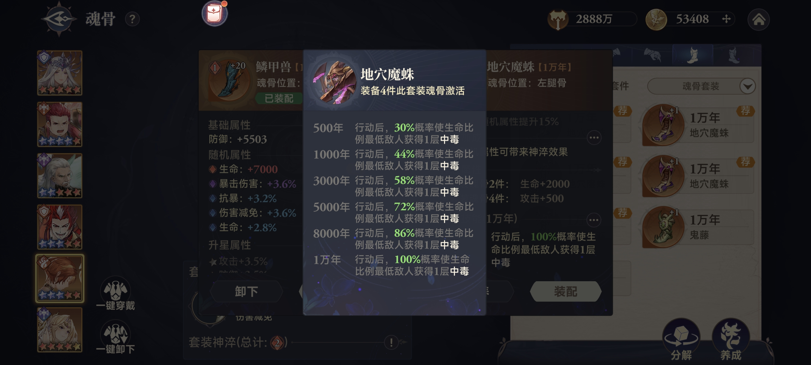 推荐原因:地穴魔蛛套的效果与爬行3和5魂环类似,看似只能让敌方单体中毒没啥用,实际上却能更快叠满3星专武的减益效果,收益很高。