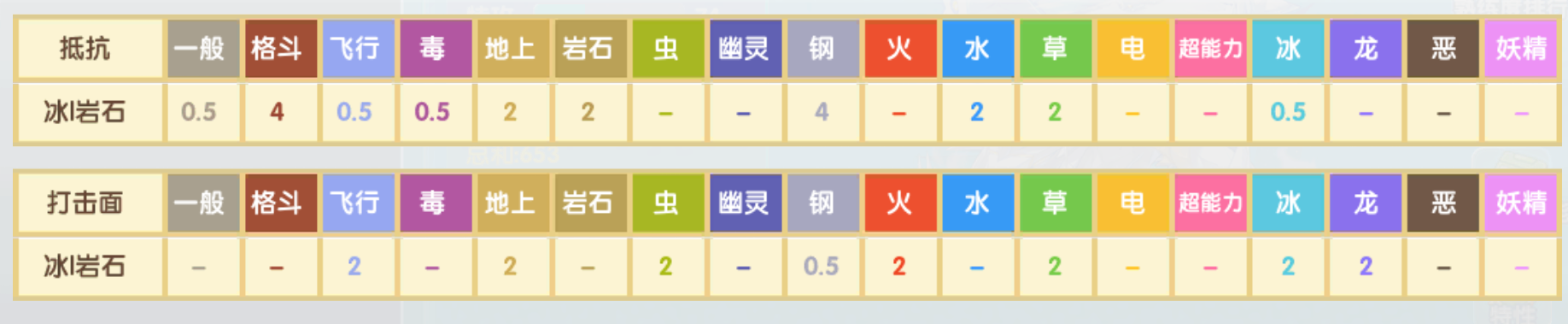 大家可以看一下他的抵抗面,实在是有点过于坑了,只有四种属性的抗性弱点方面的话,不用多说太多了,其中水属性是他最大的弱点,因为目前来说,整个游戏环境现在,水属性的输出能力可以说是非常的高,比如说新登场的洛奇亚,还有小马哥,还有小鳄鱼,小鲨鱼,这些无非都是它的天敌,其中新的小马哥可以说是很克制他的,就是天克,那么闪光冰岩怪的环境,我个人感觉只有避免受到水属性的伤害,那么它的存活率就会比较高,一旦受到伤害,特别是特攻的,基本上被秒杀的可能性很大,所以说在这里一定要小心钢属性的弱点,不用多说了,基本上代表宠物也只有高端局的苍响和闪光钢龙为主,地属性弱点,大部分都集中在基格尔德,上面但是我想说的是冰岩怪一旦承受住基格尔德的伤害,那么反手一发冰,我估计基格尔德肯定是很难吃的消的,不死也残,缺点就是在于这个宠物会一个先手技能,但是这个先手技能还没有出现售卖的情况,所以这就很尴尬了,但是这个宠物会超级咬碎可以在关键的时候把基格尔德先手秒了