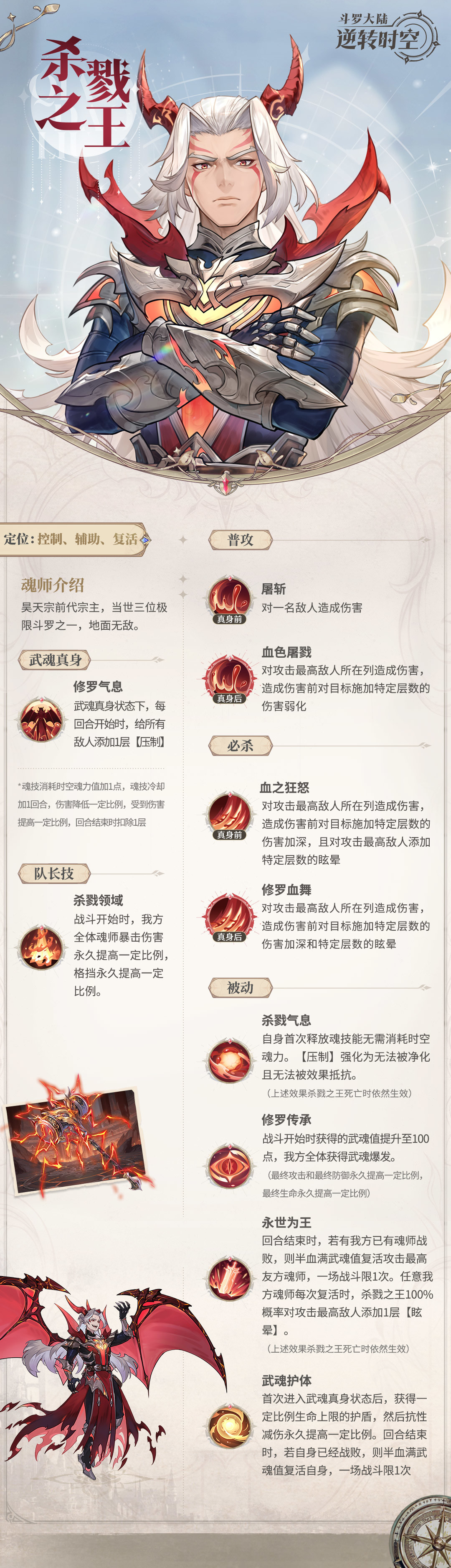 在《斗罗大陆:逆转时空》里,杀戮之王的定位是控制,辅助,复活。武魂真身状态下,每回合开始时,给所有敌人添加1层【压制】。