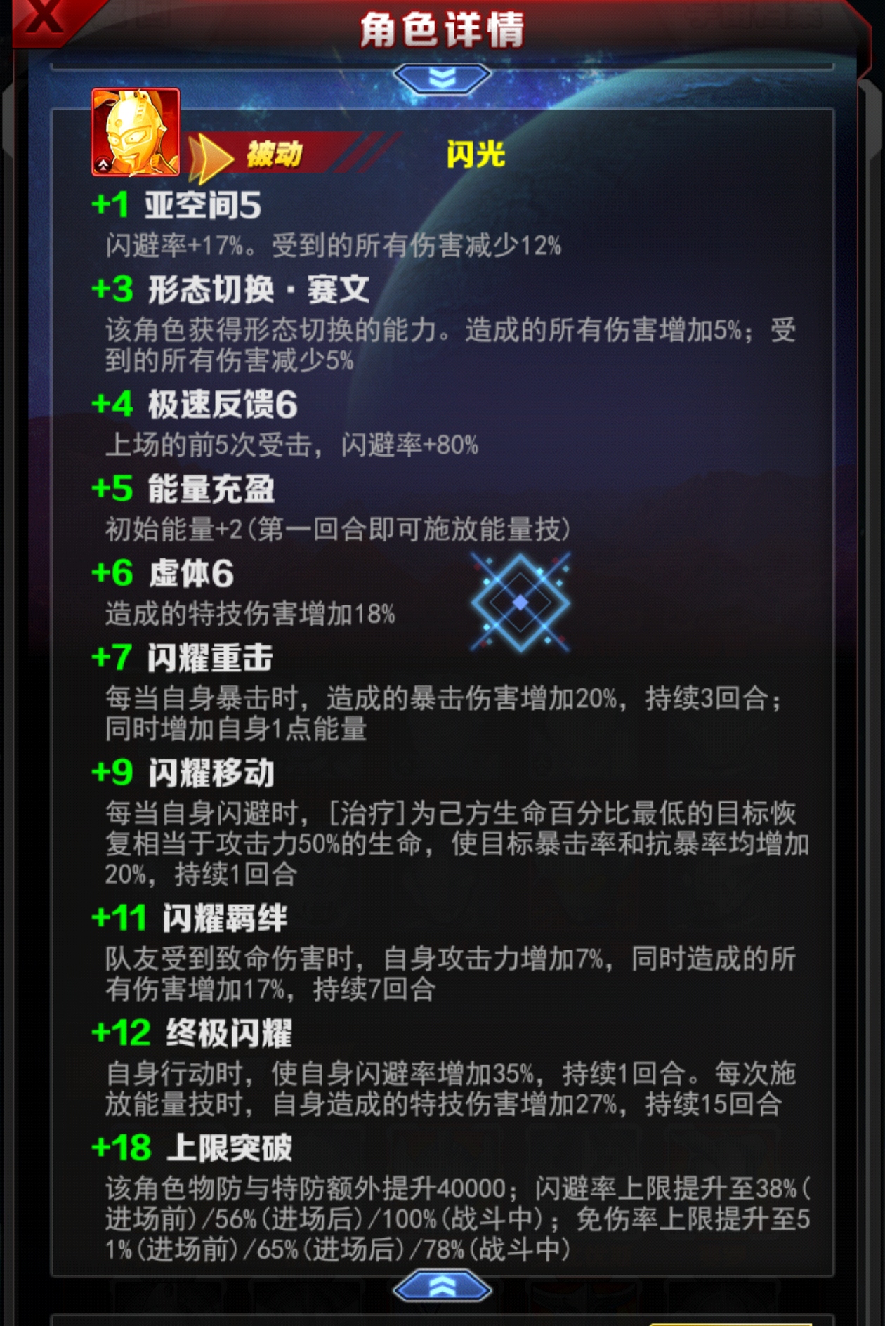 1.上场的前5次受击,闪避率增加80%。这个属性在战斗初期提供了非常高的闪避概率。在开场阶段,面对敌人的攻击,角色有很大机会躲避,从而减少受到的伤害,保护自己的生命值,并且可能打乱敌人的攻击节奏。