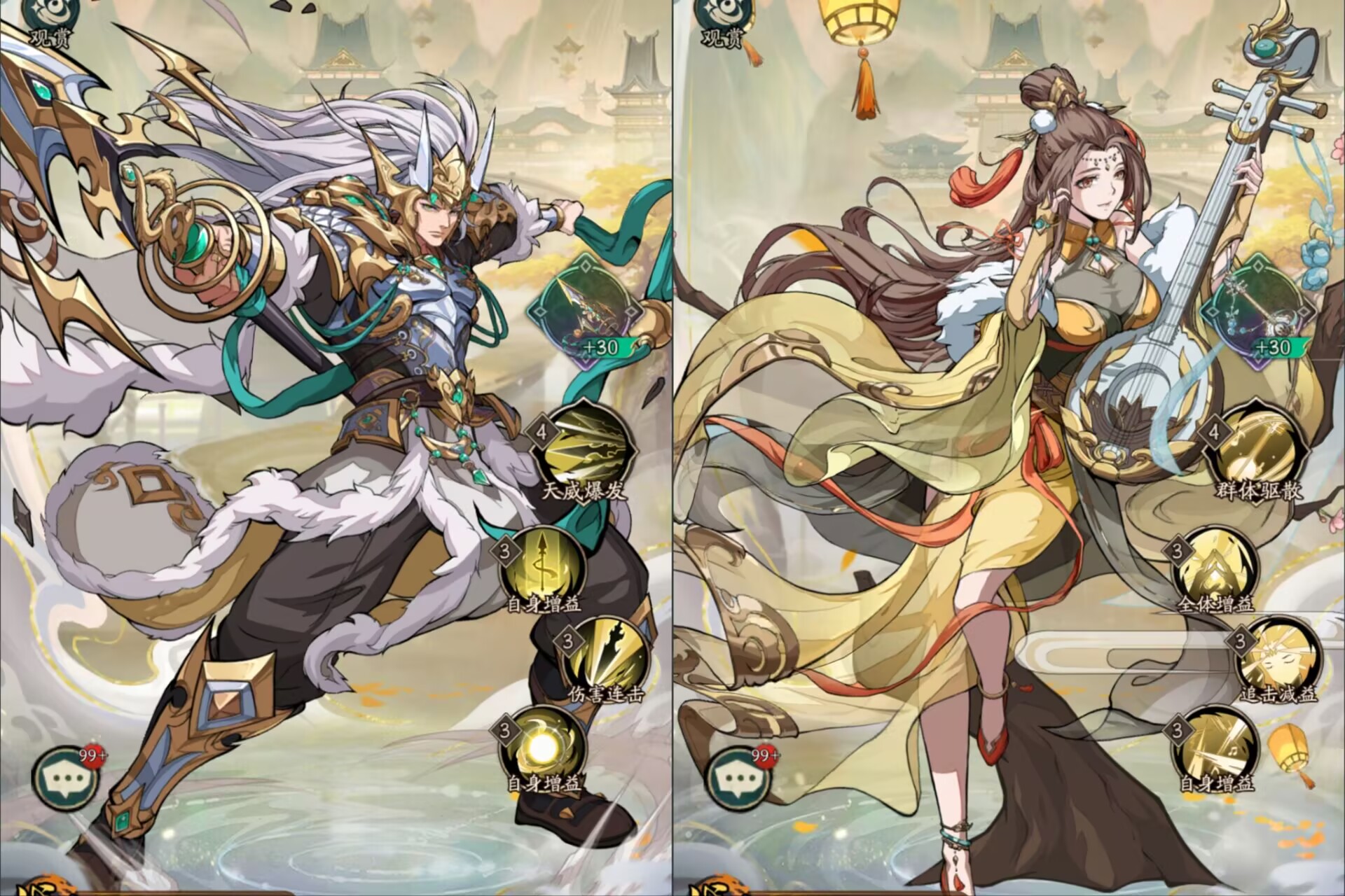 吕布:自身输出极高,而且还有强大的增伤和攻击加成以及一定的自我回复能力,能够对敌人造成降减和破甲效果,变身状态下更是恐怖如斯!搭配上典韦,两个站前排,能抗能打!