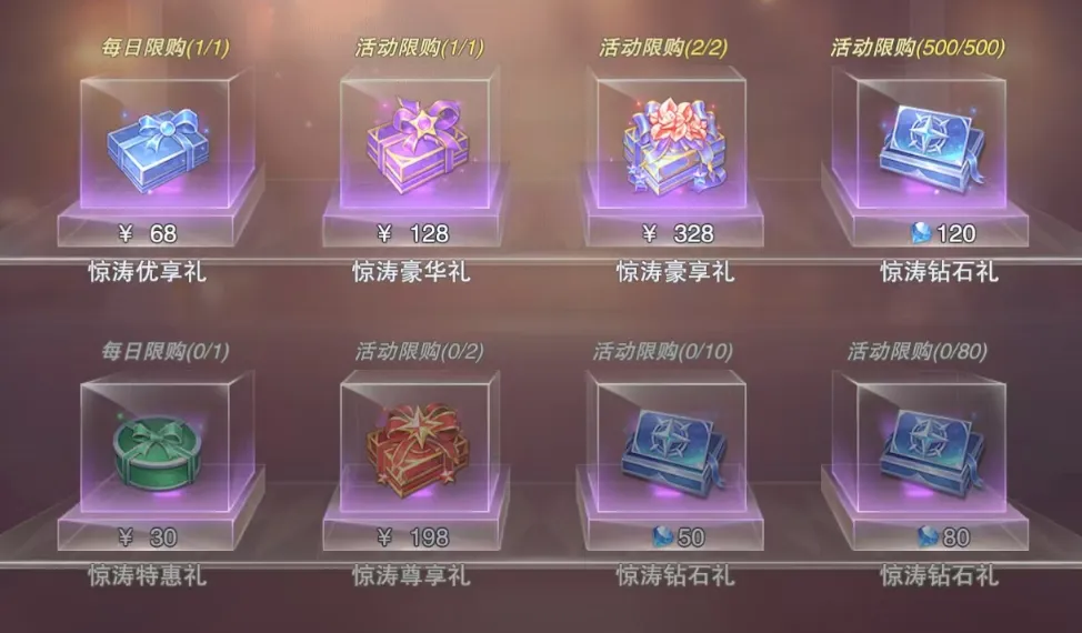 诶......看到这大家是不是觉得有点奇怪,咋钻石只能买10抽呢?结合到上次的秘藏类型活动敏感的朋友们应该就有所警觉了,这次果然不出意料又是一个不充RMB举不给额外钻石礼包购买机会的活动,因为想要开其余钻石礼包的话我们都得直接买完198元礼包档位才行(如下图所示,买完两个198元礼包才会解锁80钻/抽,限购80抽和120钻/抽,限购500抽的钻石礼包购买权限),开个玩笑就是:只需两个198就咱们就能拥有VIP级别的钻石购买权限,勇士们快冲啊,不拉满就废了......