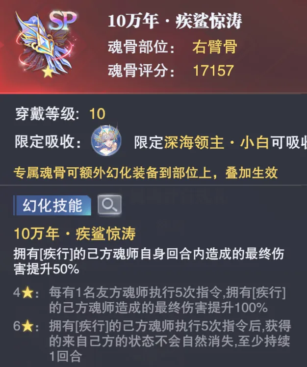 而SP小白的这个右臂专属魂骨的确具有比一般专属魂骨更高的长图增伤预期(理论上有5-6倍的增伤),而且大家也看到了其黄色6星效果直接就把SP宁荣荣“神恩”里边,获得的状态不会消失,至少保留1回合的功能给继承了过来,所以官方说白了,他的意思就是要大家用SP小白来把SP宁荣荣给干了......