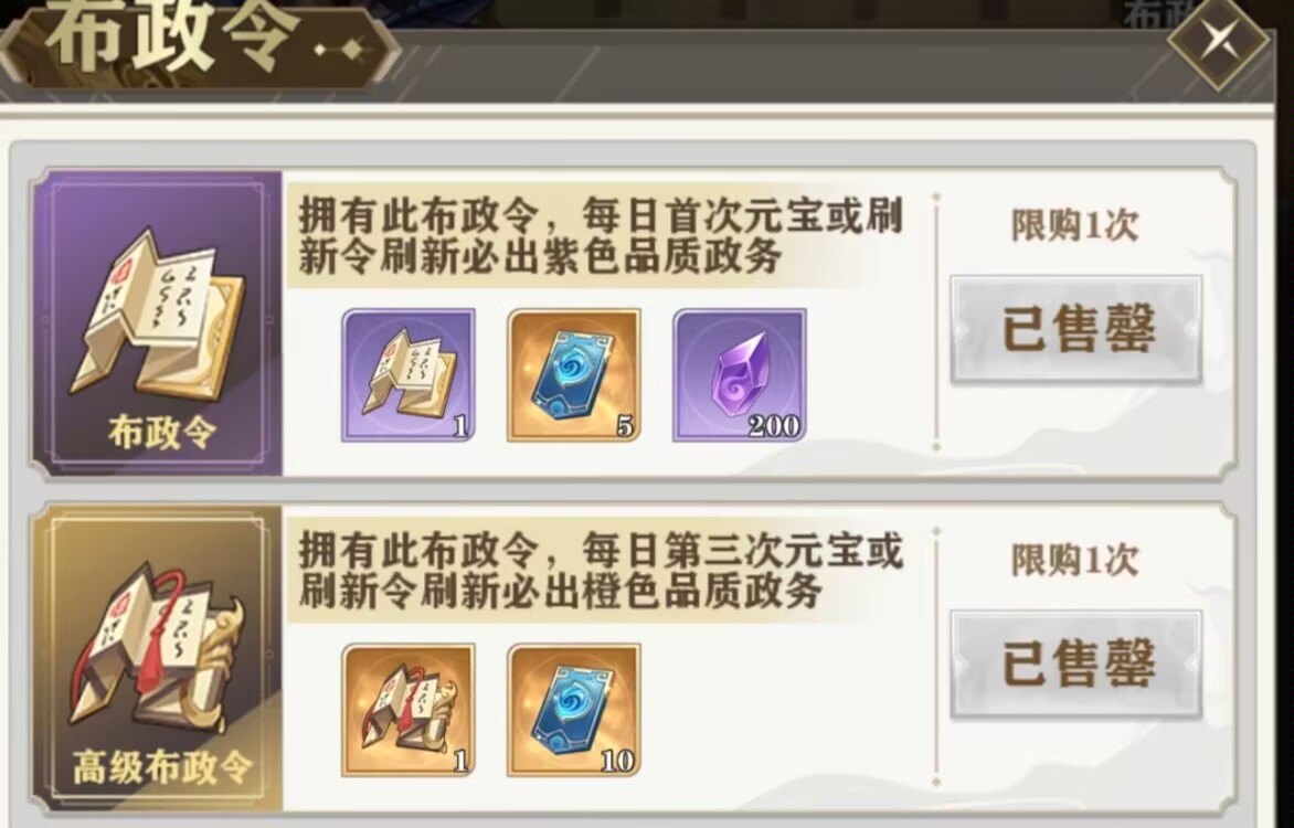 布政令和高级布政令。开荒攻略中也说了,必买的!买一次就是永久!可以提升我们出高品质的任务的几率。