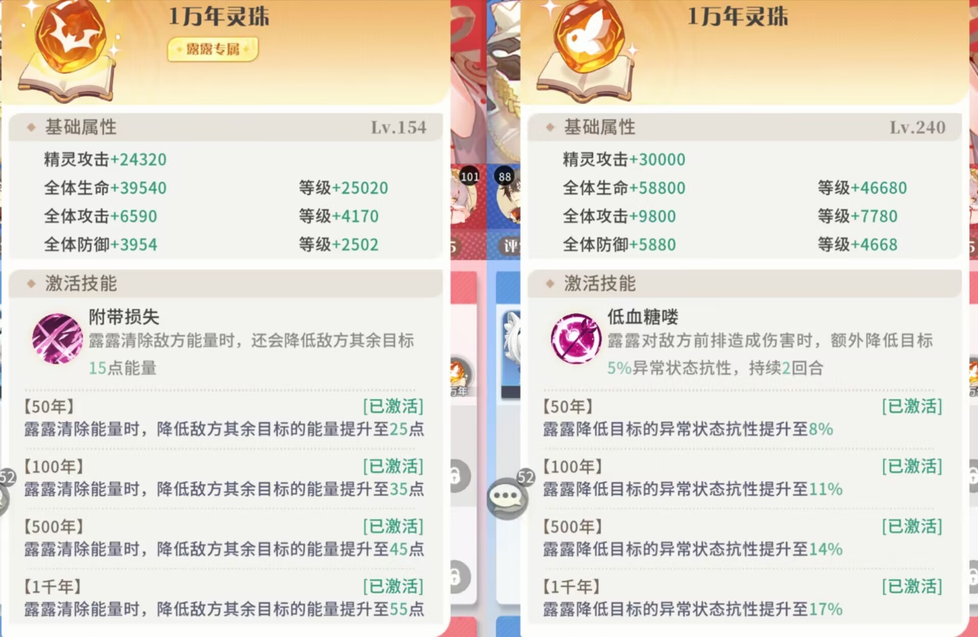 所以优先把1万年的宝珠分配给哪个技能,大家都明白了吧?优先分配给三技能和四技能,激活露露的全体削能和全体回能,直接加强露露的实战作用,三技能和四技能才是露露的核心技能。