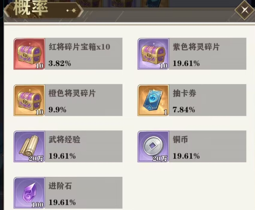 顾名思义【将灵秘境】就是主要抽取我们将灵的地方,除了将灵还可以抽取到招募卷、武将经验、铜币、进阶石等道具。