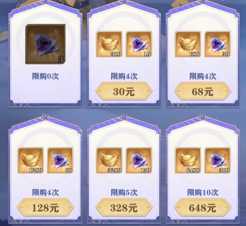 那么需要买:4个30元礼包+3个68元礼包+4个128元礼包+4个328元礼包+2个648礼包。