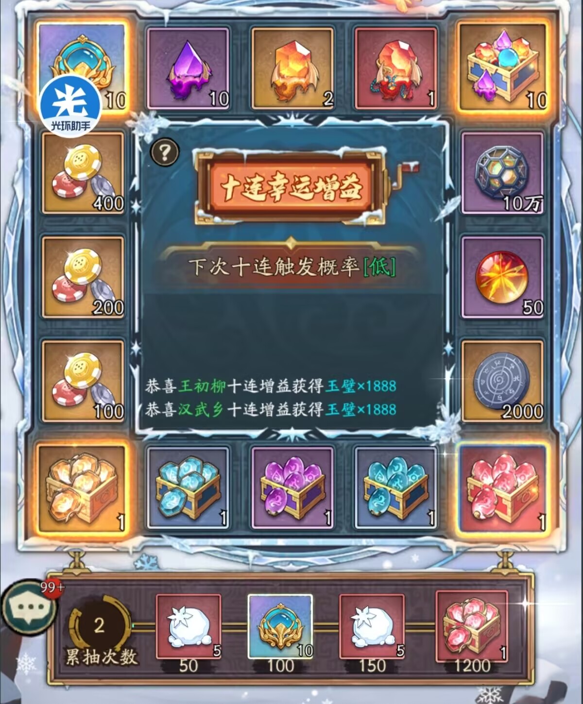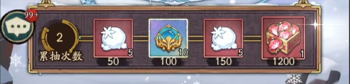 累抽奖励一共是1200抽!主要是可以获得雪球、无双之心、宝石奖励。