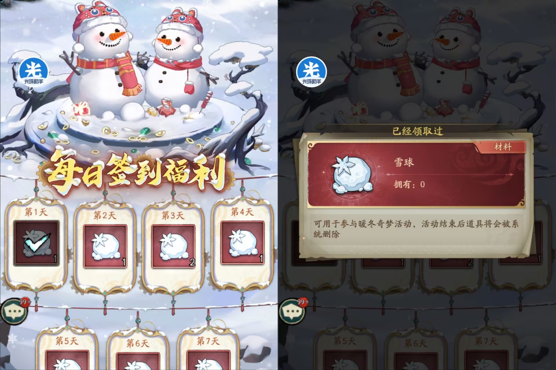 每天登录送温暖,7天一共可以获得10个雪球!