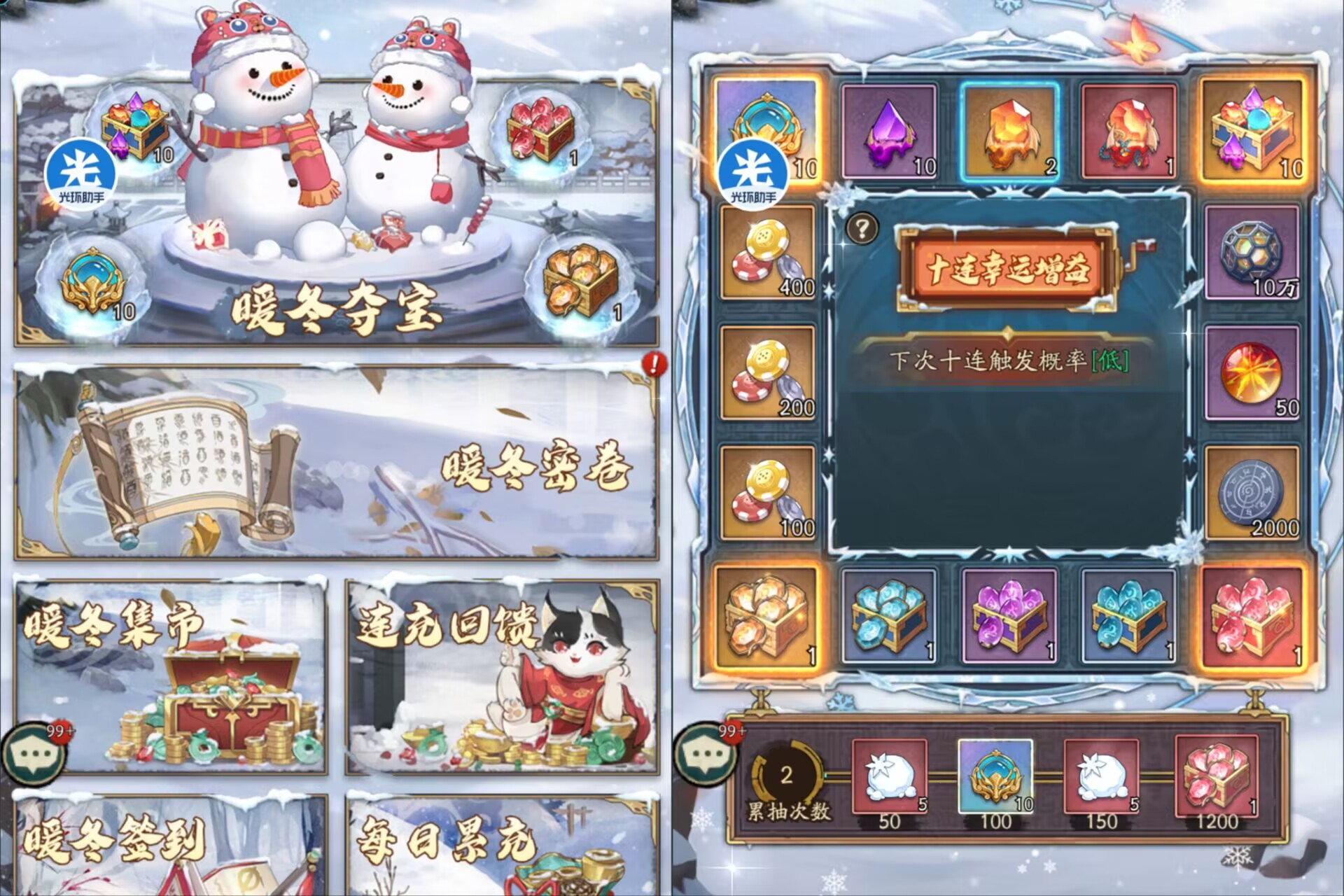 1暖冬夺宝。2暖冬密卷。3暖冬集市。