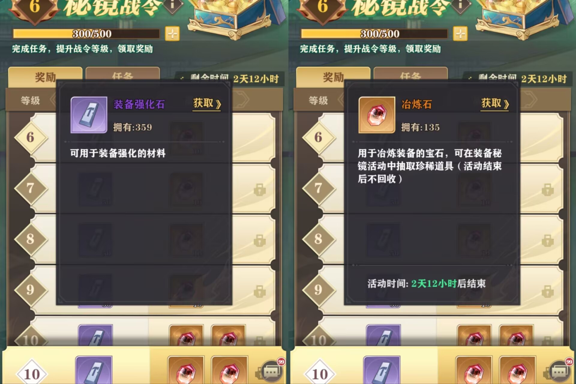 秘境战令:①白嫖:任务全部做完可以获得900个装备强化石(蚊子腿奖励,900个强化石一下子用完了)