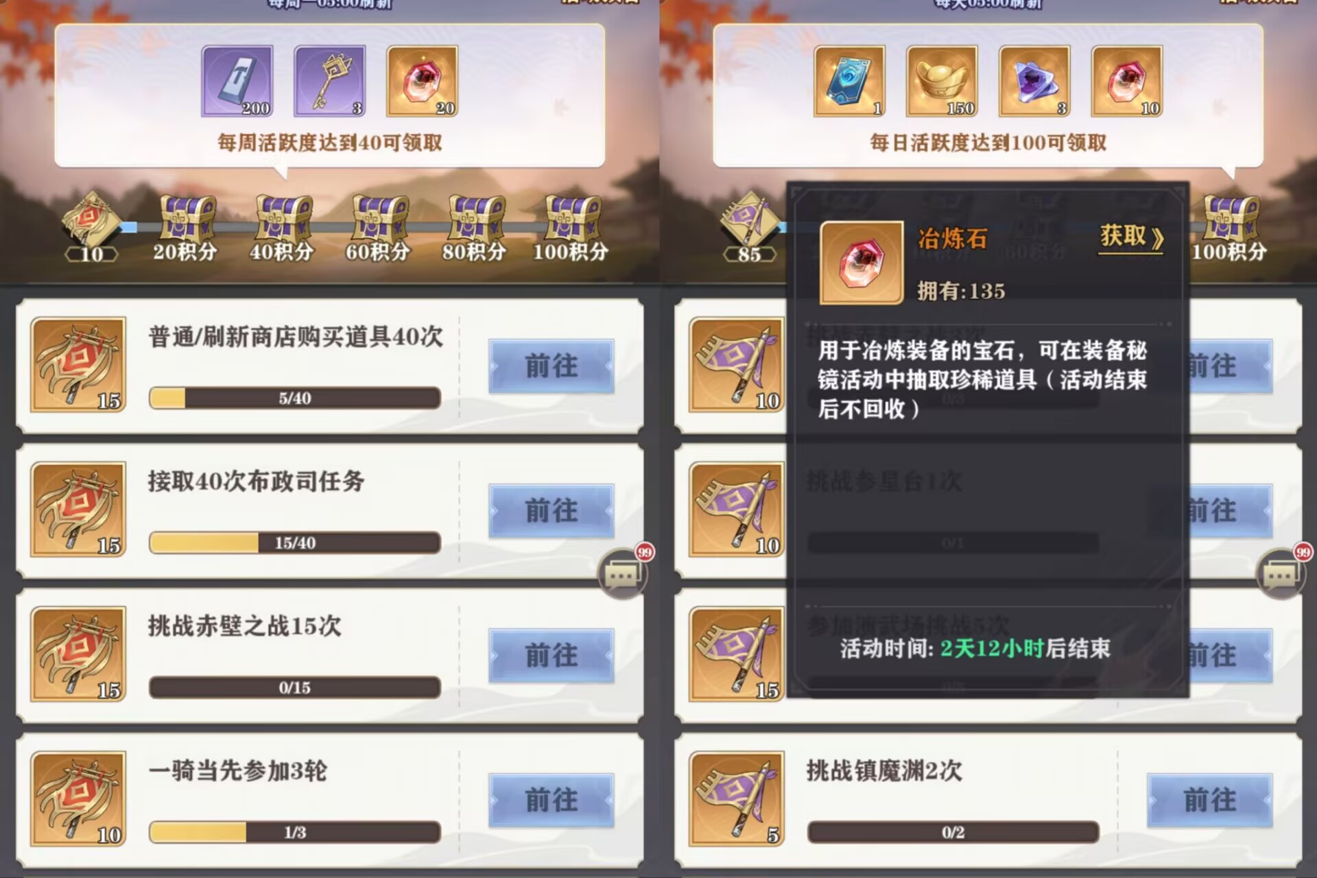 这里有玩家会问了:冶炼石有哪些获取途径?①每周任务宝箱可以领20个。
