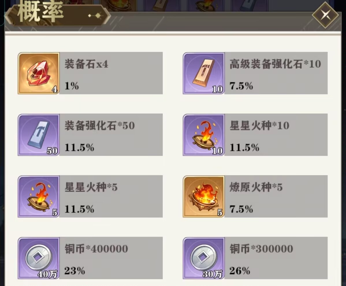 一:【装备秘境】玩法解析。该活动顾名思义就是和装备有关,主要是获得:装备石、装备强化石、星星火种、缭原火种这些强化装备的资源。