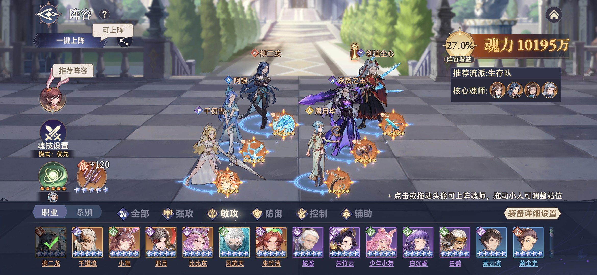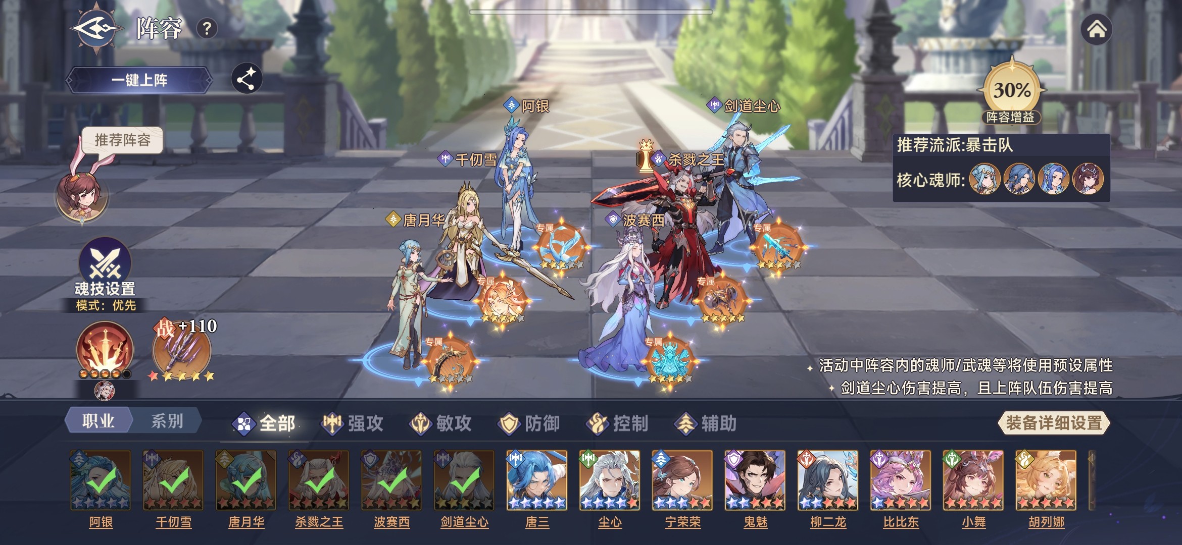 因剑道▪尘心未红1星,没法开局开武魂,所以可以作为副c进入玩家主队。建议剑道▪尘心最好抽到黄4星,拥有队长技、剑韵初始有3层(大于1层时领悟剑气,伤害必定暴击,且无视敌人暴击抵抗),这样能打出更高伤害。参考阵容如下: