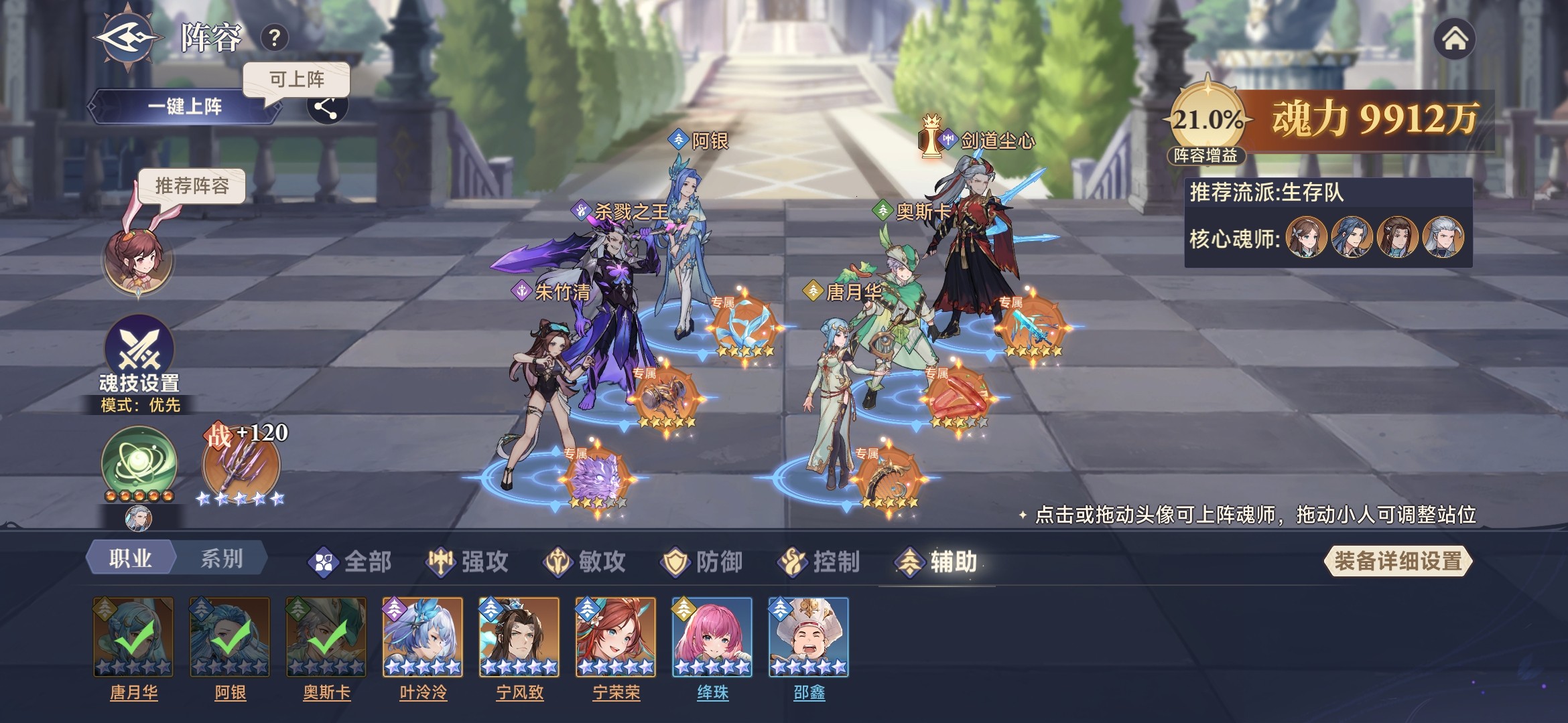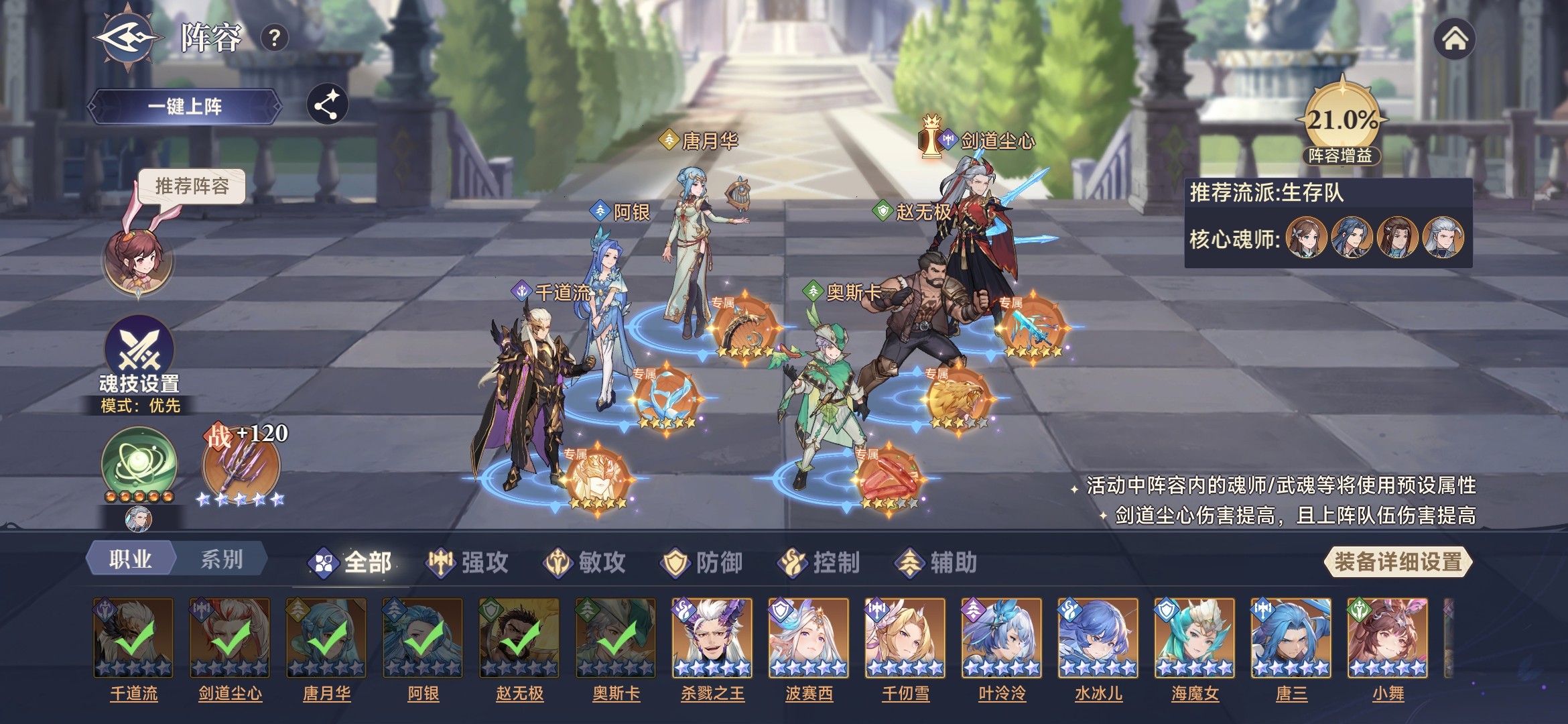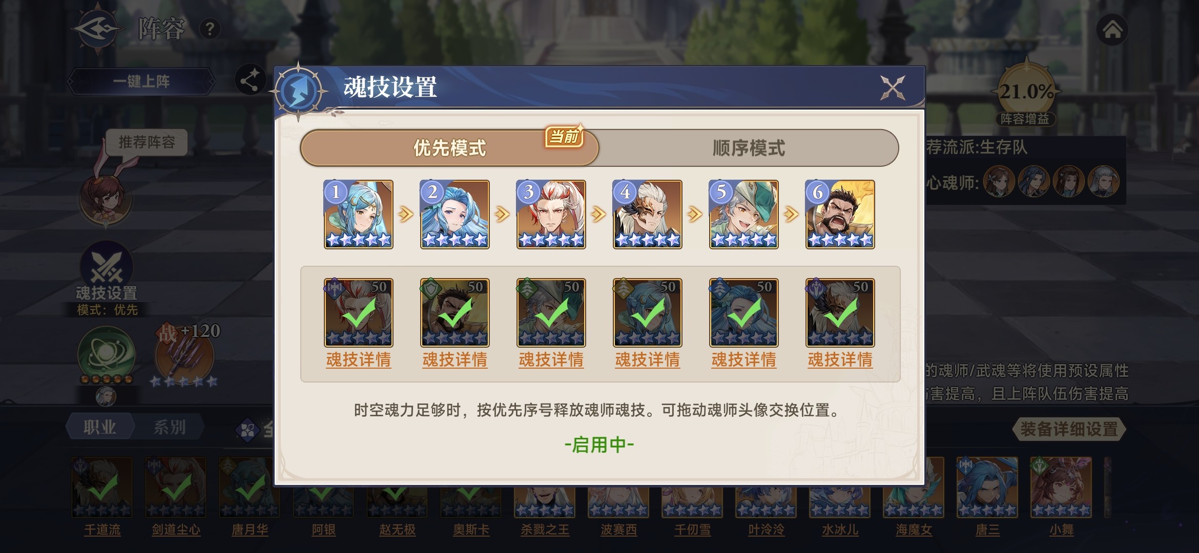 采用优先模式,保证1号位和2号位魂技释放。唐月华、阿银作为辅助魂师,放在1号位、2号位,为剑道▪尘心极限输出提供buff支持。剑道▪尘心和千道流放在3号位、4号位,赵无极、奥斯卡魂技顺序无特殊要求。