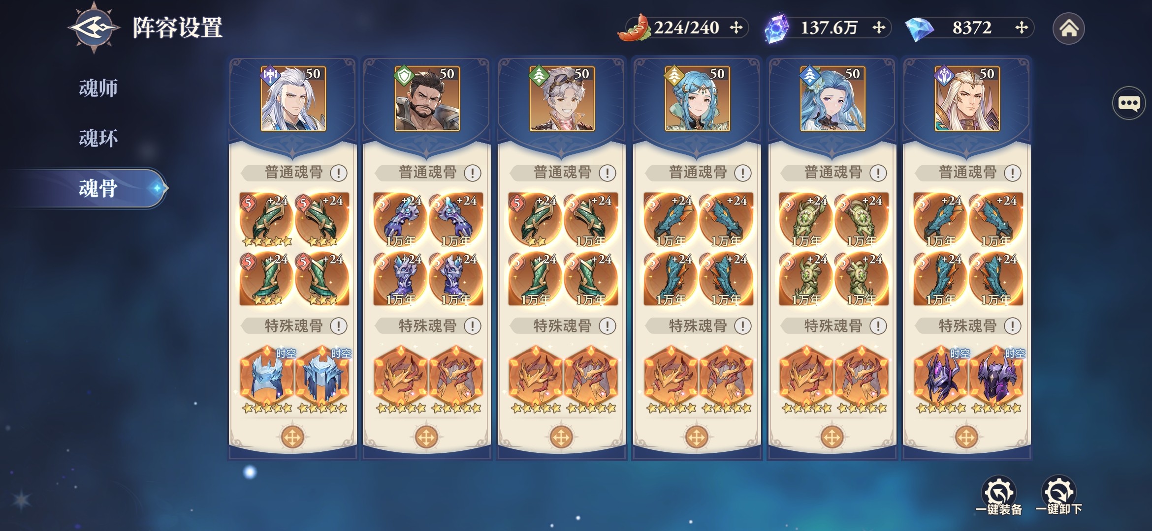 其他魂师的魂骨由系统推荐确定,外附魂骨都选择烈火杏娇疏,能够最大限度的为全体提供增伤和减伤。
