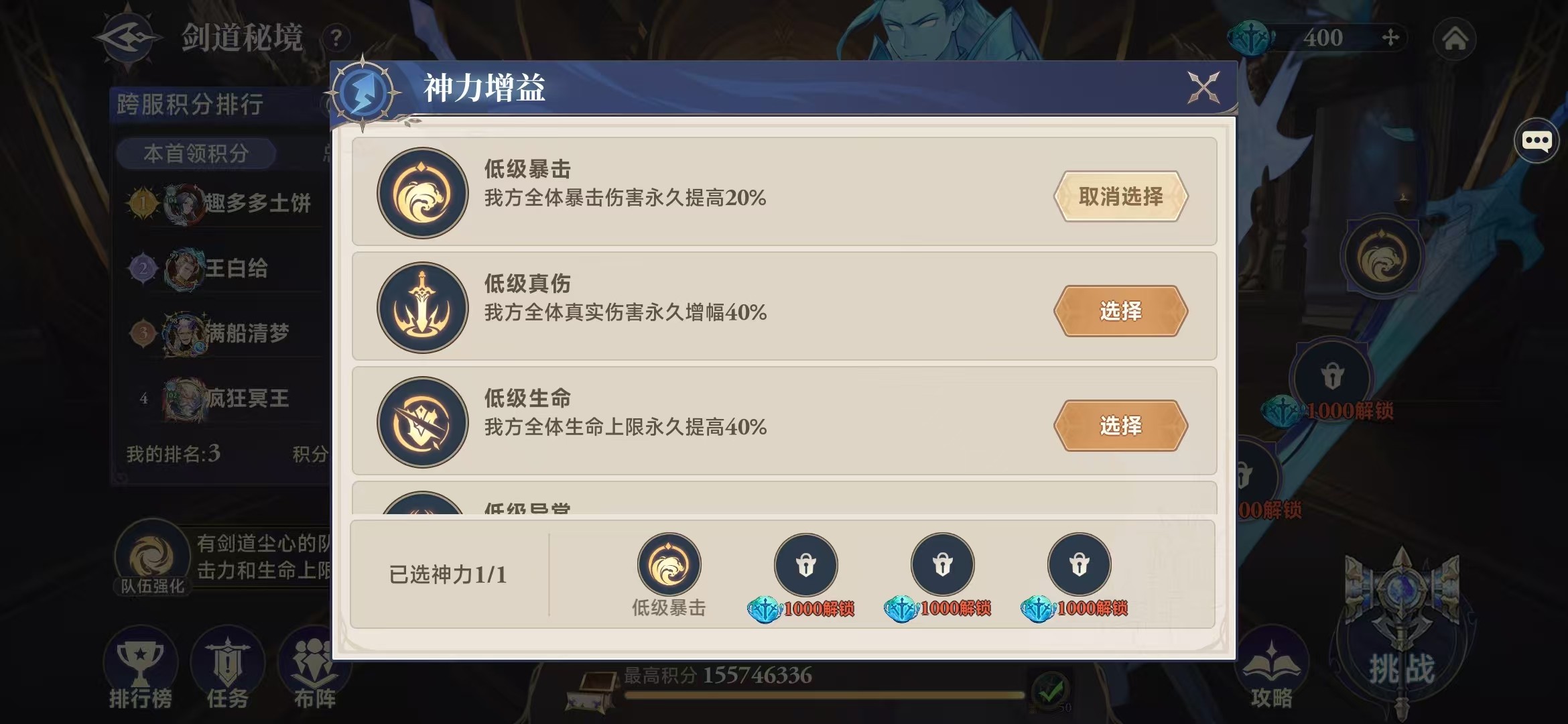 ②中氪、顶氪:剑道▪尘心练度较高,红5星有免死一次,建议全部装配猛兽系,提高极限输出能力。