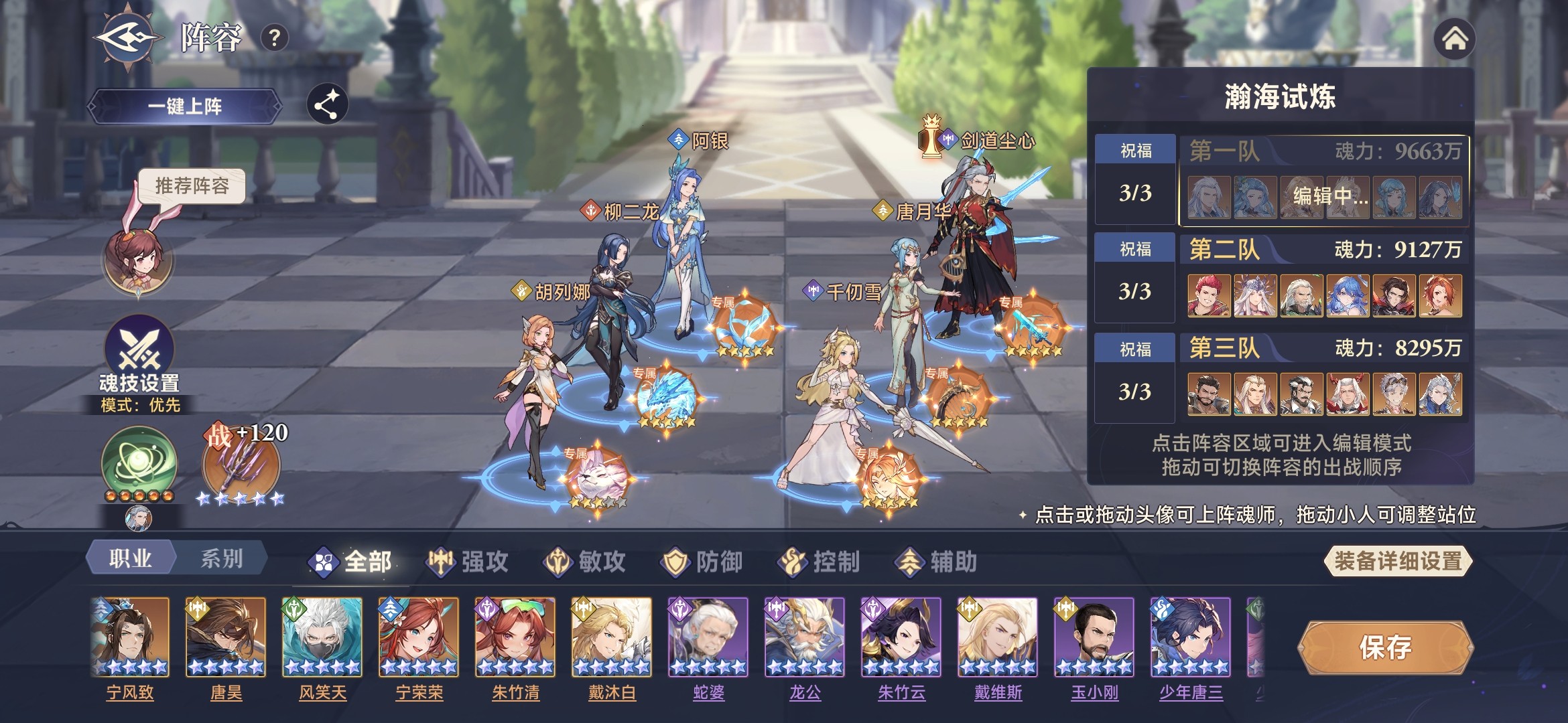 ③剑道▪尘心阵容:剑道▪尘心可以替换唐三或低练度千仞雪,保持双核输出阵容,通过唐月华、阿银、柳二龙提供的暴击、爆伤、魂技增伤等各类增益来强化剑道▪尘心的极限输出能力,构建暴击队进阶版。