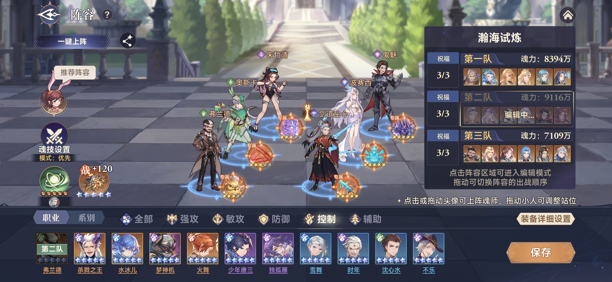 ②常用队伍:波塞西+鬼魅+奥斯卡+朱竹清+戴沐白+弗兰德或千道流+尘心+赵无极+宁荣荣+宁风致+呼延震;增益为【反击】【复苏】【守护】或【反击】【复苏】【守护】。
