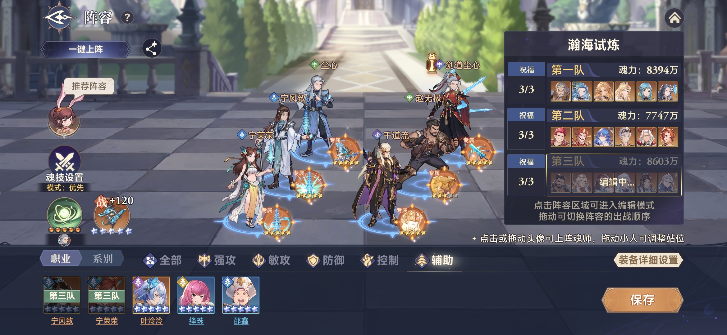 ②常用队伍:千道流+尘心+赵无极+宁荣荣+宁风致+呼延震;增益为【反击】【复苏】【守护】。