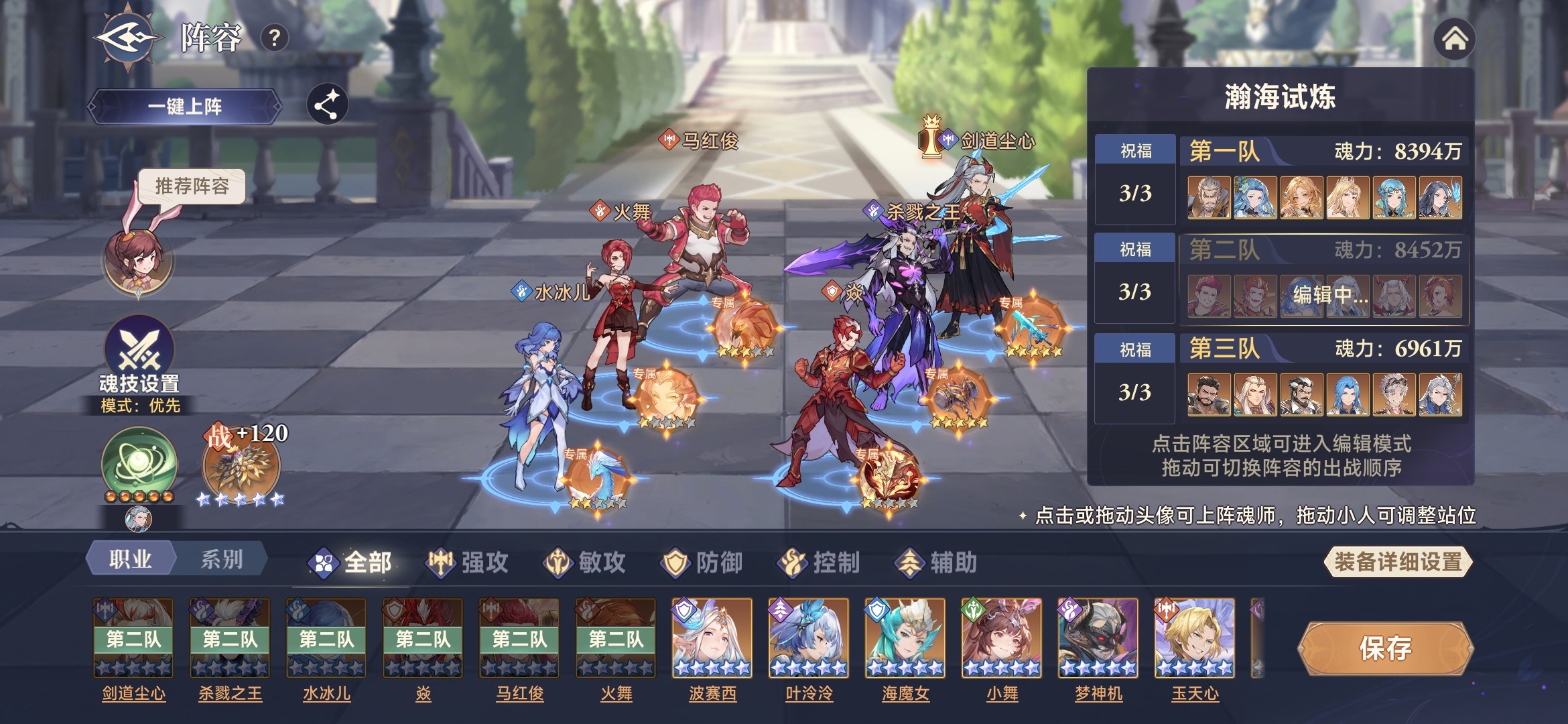 剑道▪尘心作为主C,站1号位,率先出手,赵无极作为防御魂师对位敌方首领怪,奥斯卡坦度较高,可以站前排抗伤,阿银、唐月华在后排,提供增益buff,千道流在后排补充伤害。