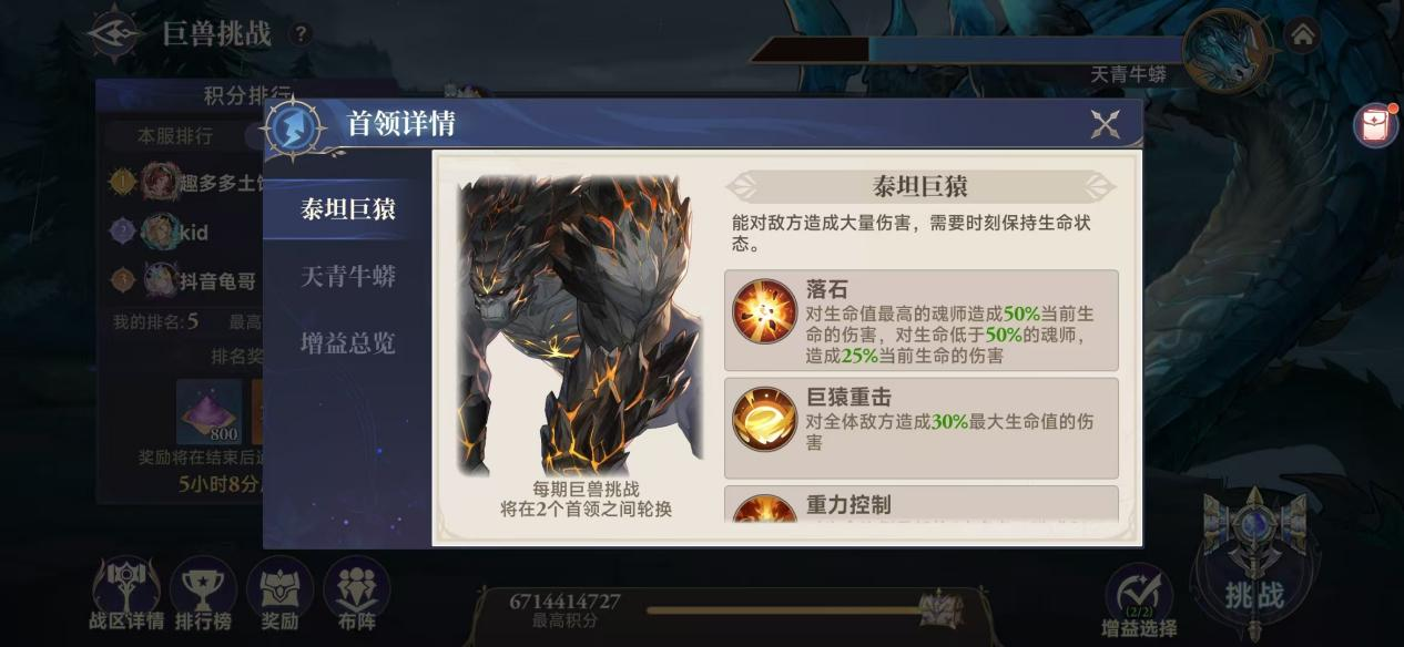 巨兽挑战里有两个BOSS,分别是是天青牛蟒和泰坦巨猿。每次开启的时候会随机出现一个BOSS,两个BOSS的技能是完全不一样的,队伍也不同,天青牛蟒带了两个小弟,而泰坦巨猿是单独BOSS。根据两个BOSS的特点,分析一下怎么围绕剑道▪尘心组队打高分。