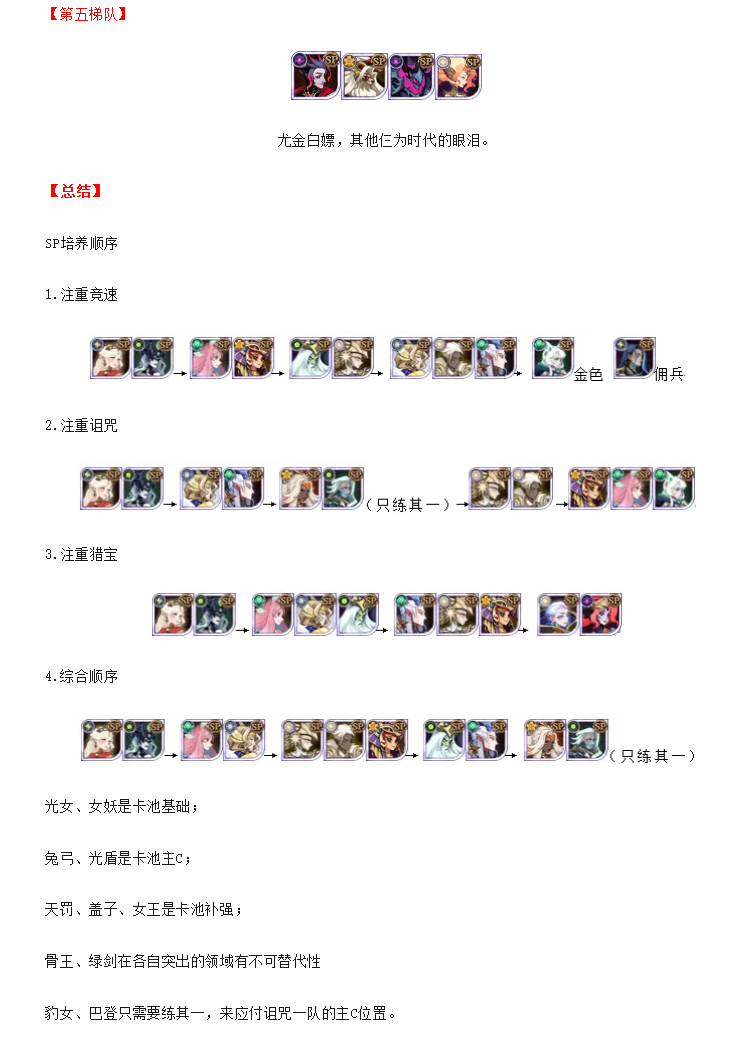 我把女妖和光女放在第一梯队,是因为她们能帮你的卡池强度打下很好的基础。有了基础之后,我们再根据当下的环境追求版本的主流SP,这才不容易掉队。