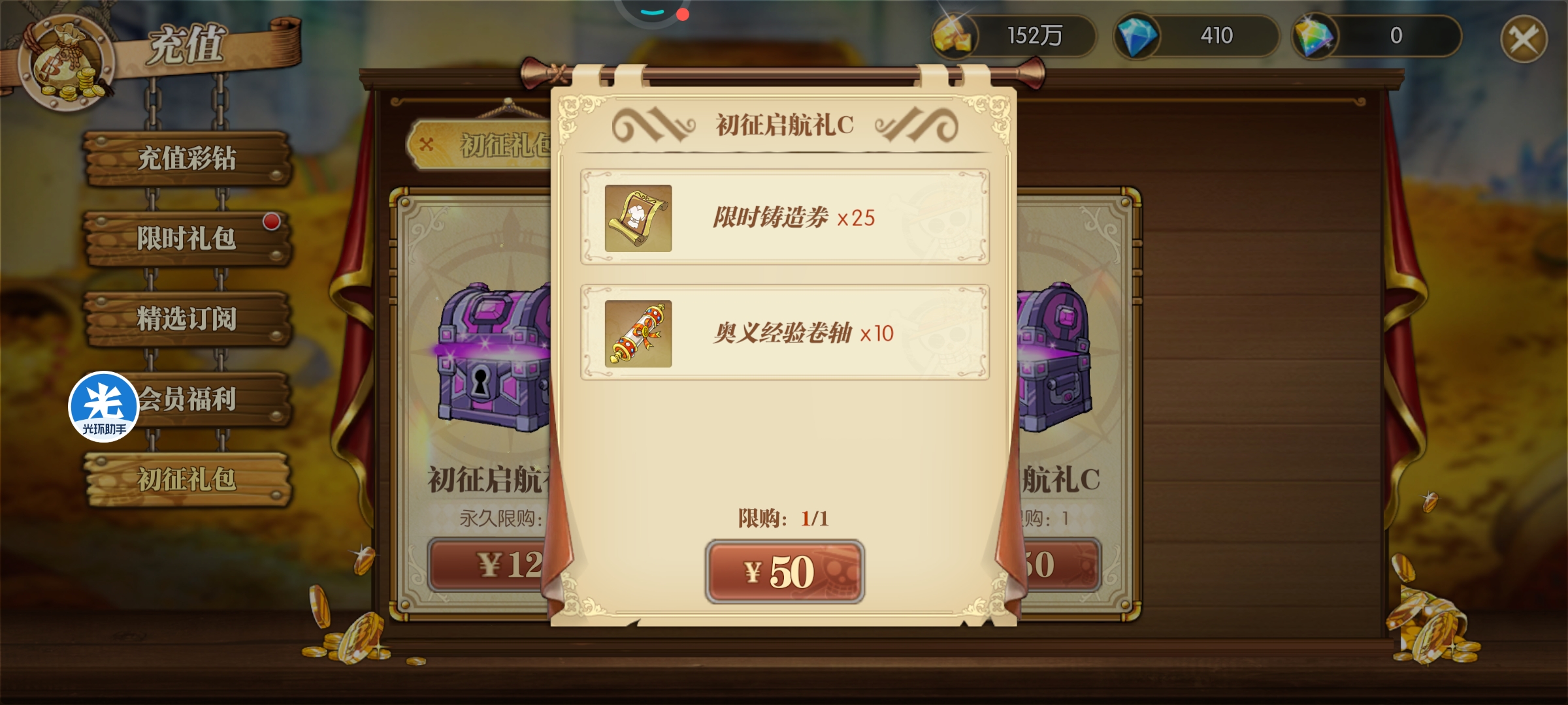 2、其次初征启航礼包C:50元可以获得25张装备铸造券
