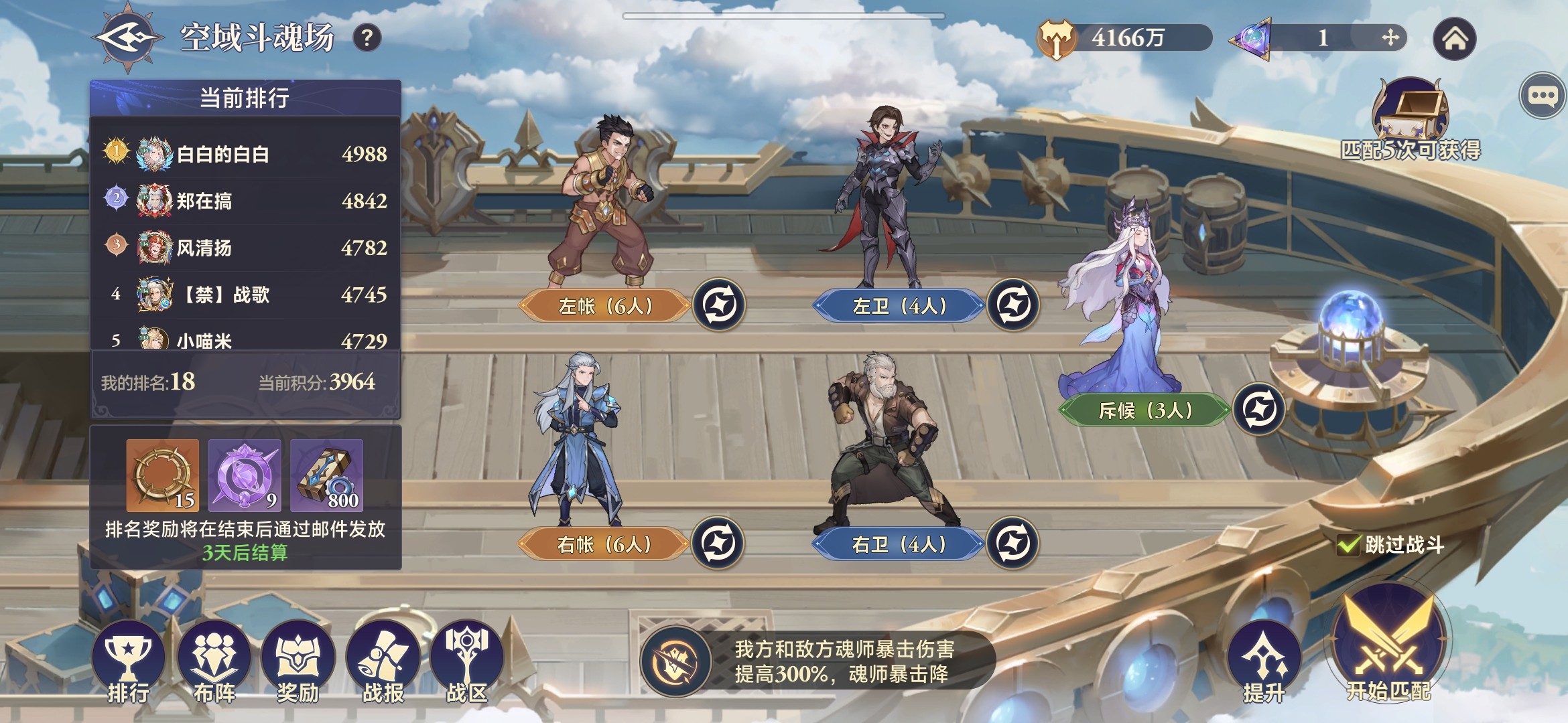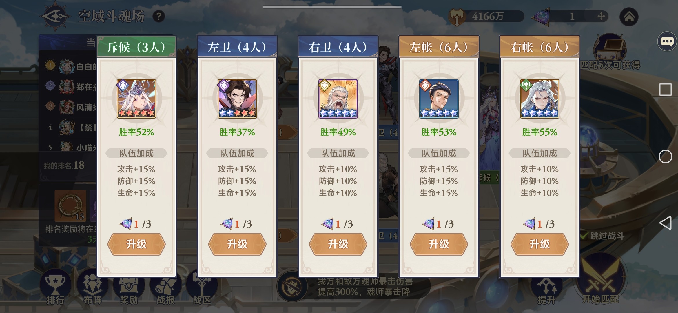 这是常驻玩法,每周一早10点开启新一轮赛季,每周日晚10点结算。分为5队进行竞技,按照古代行军作战部署,分别是斥候(上阵3人)、左卫(上阵4人)、右卫(上阵4人)、左帐(上阵6人)、右帐(上阵6人)。