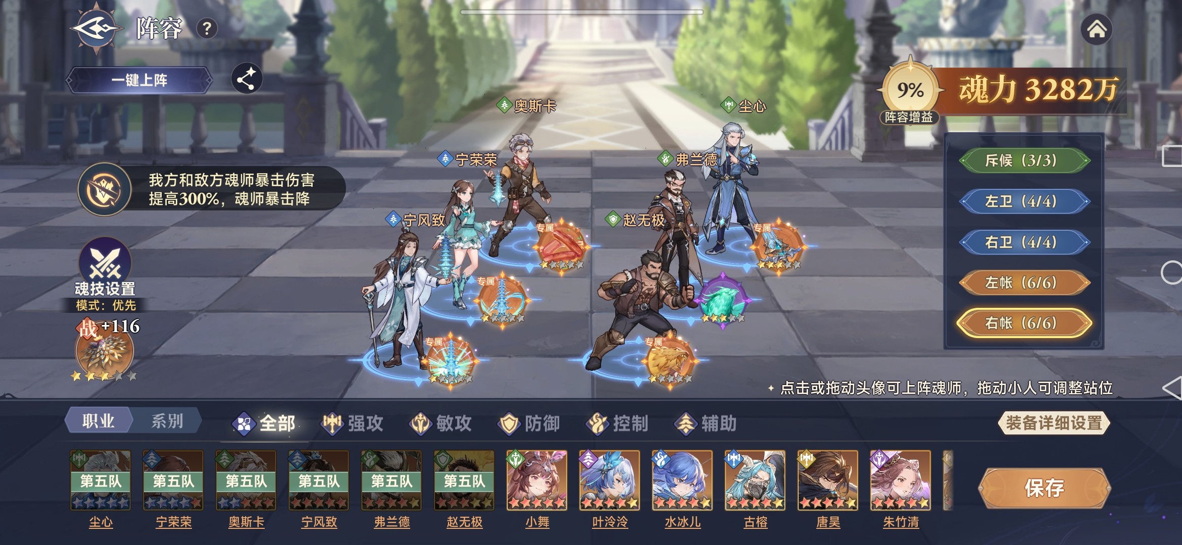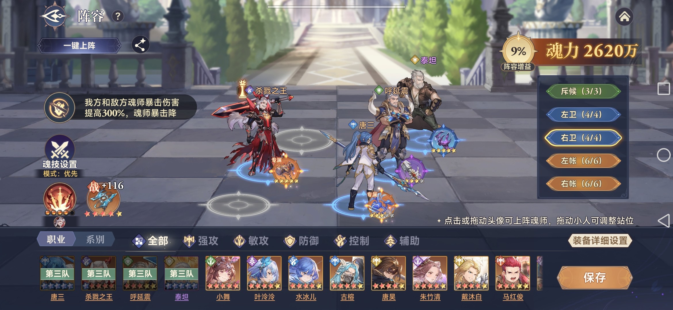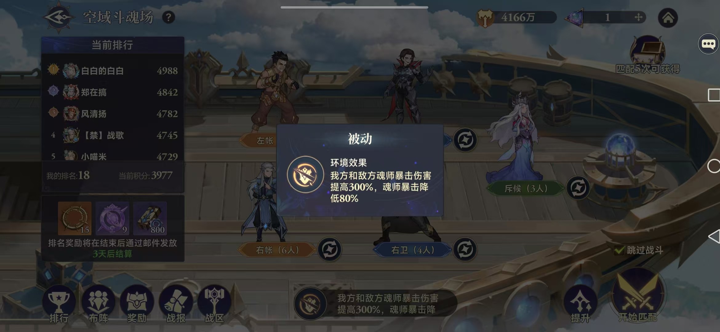 根据每轮赛季的环境效果,确定合适的阵容,组队总体思路是要做到输出、防御、辅助、控制等各类魂师进行混搭。以笔者遇到的暴击环境效果(我方和敌方魂师暴击伤害提高300%,魂师暴击降低80%)为例进行分析。
