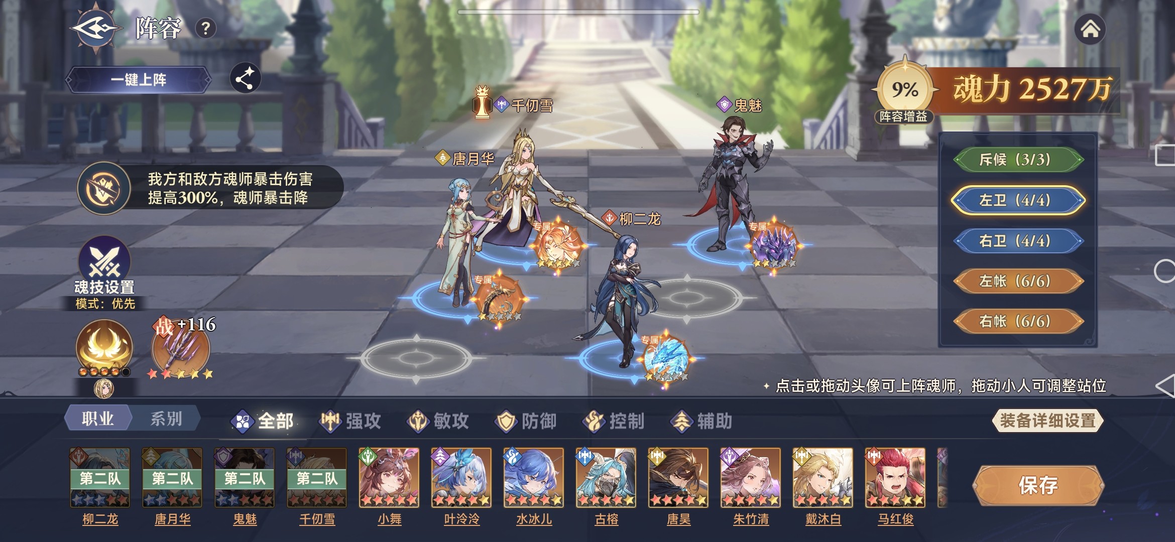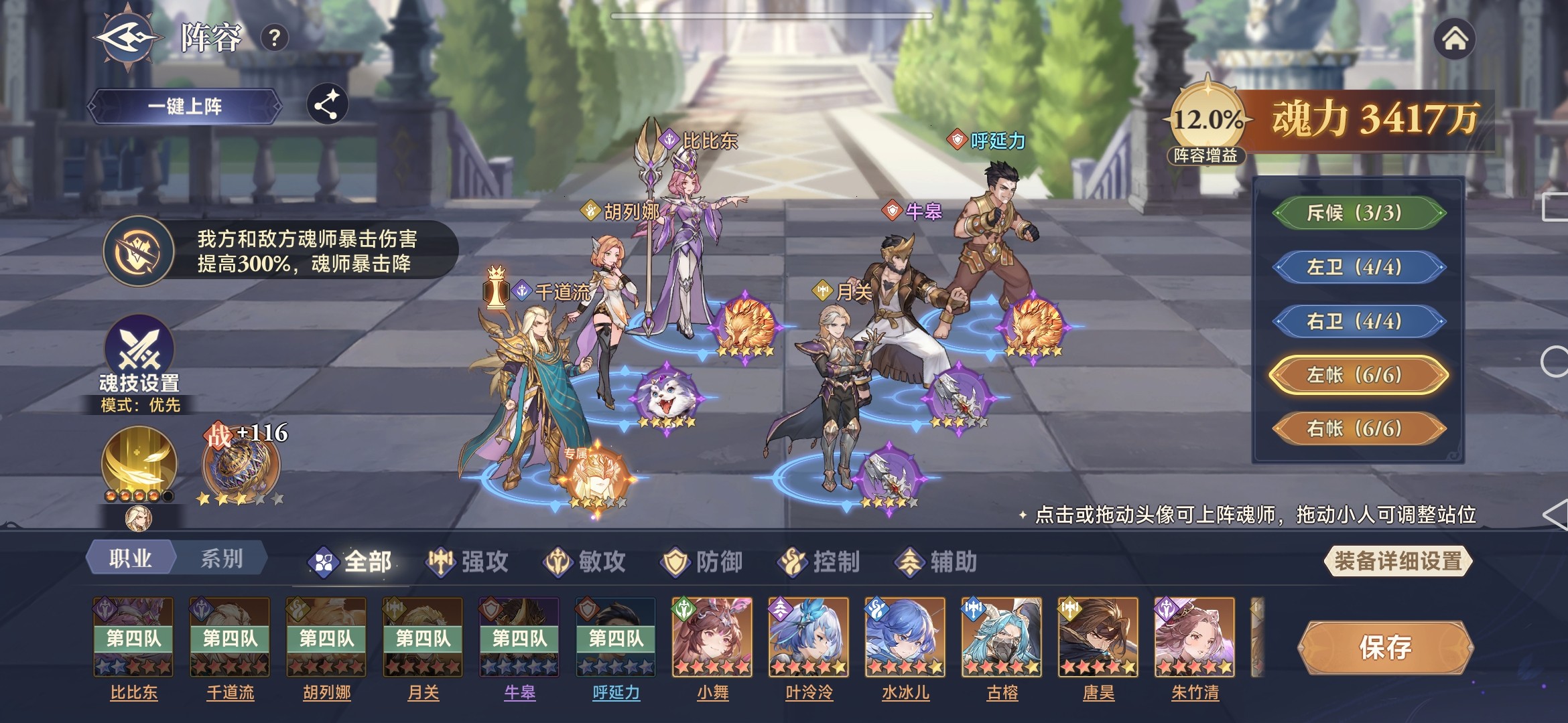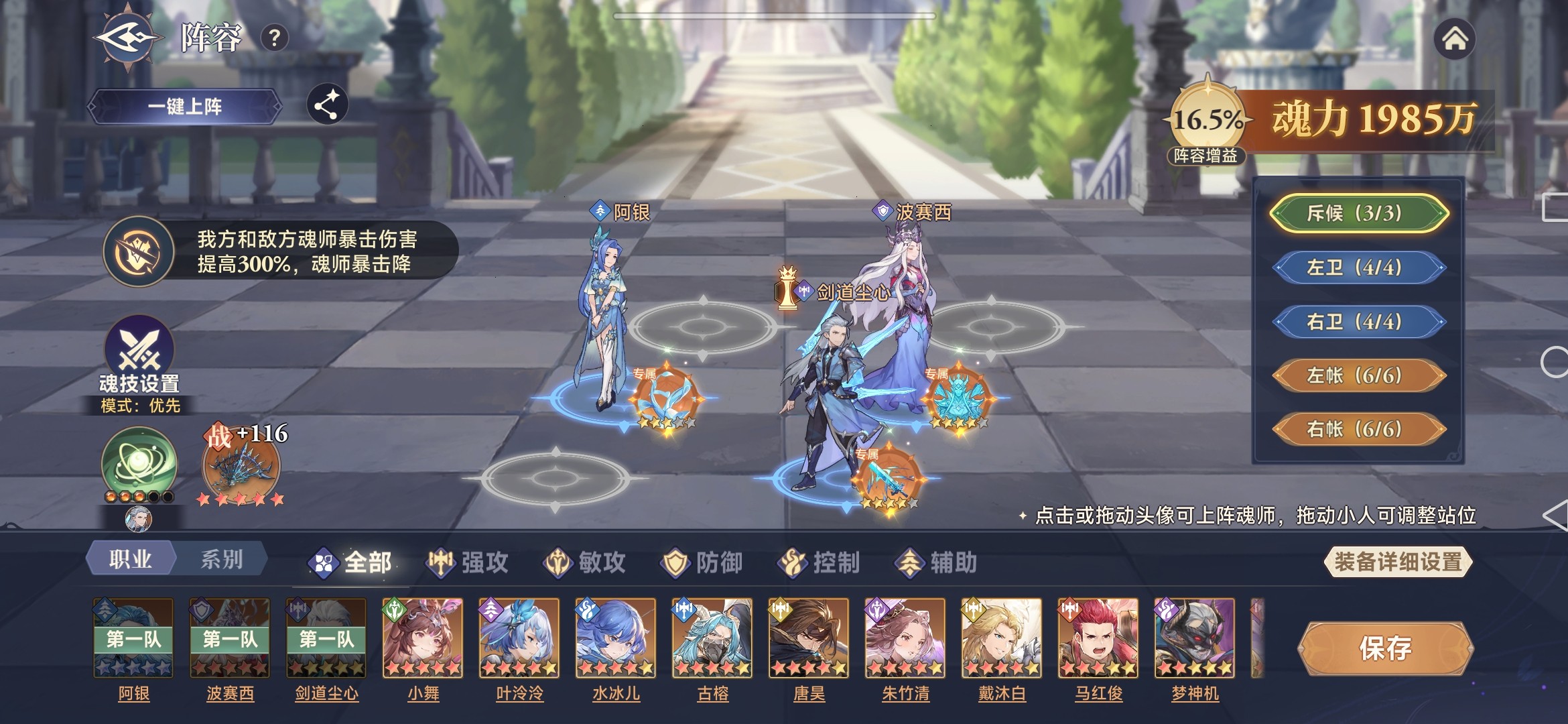根据每轮赛季的环境效果,确定合适的阵容,组队总体思路是要做到输出、防御、辅助、控制等各类魂师进行混搭。以笔者遇到的暴击环境效果(我方和敌方魂师暴击伤害提高300%,魂师暴击降低80%)为例进行分析。