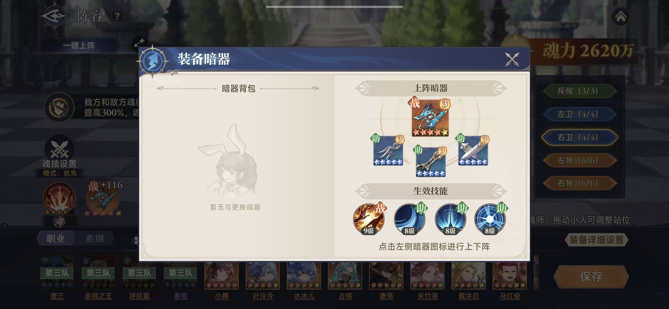 ※魂师站位和出手顺序与斥候队相同,特别是缺少波塞西等防御魂师,如果暗器星级高,很容易造成快速减员,所以先手非常重要,而魂师图鉴等级影响先攻值,显得异常关键,能很大程度上左右胜负。