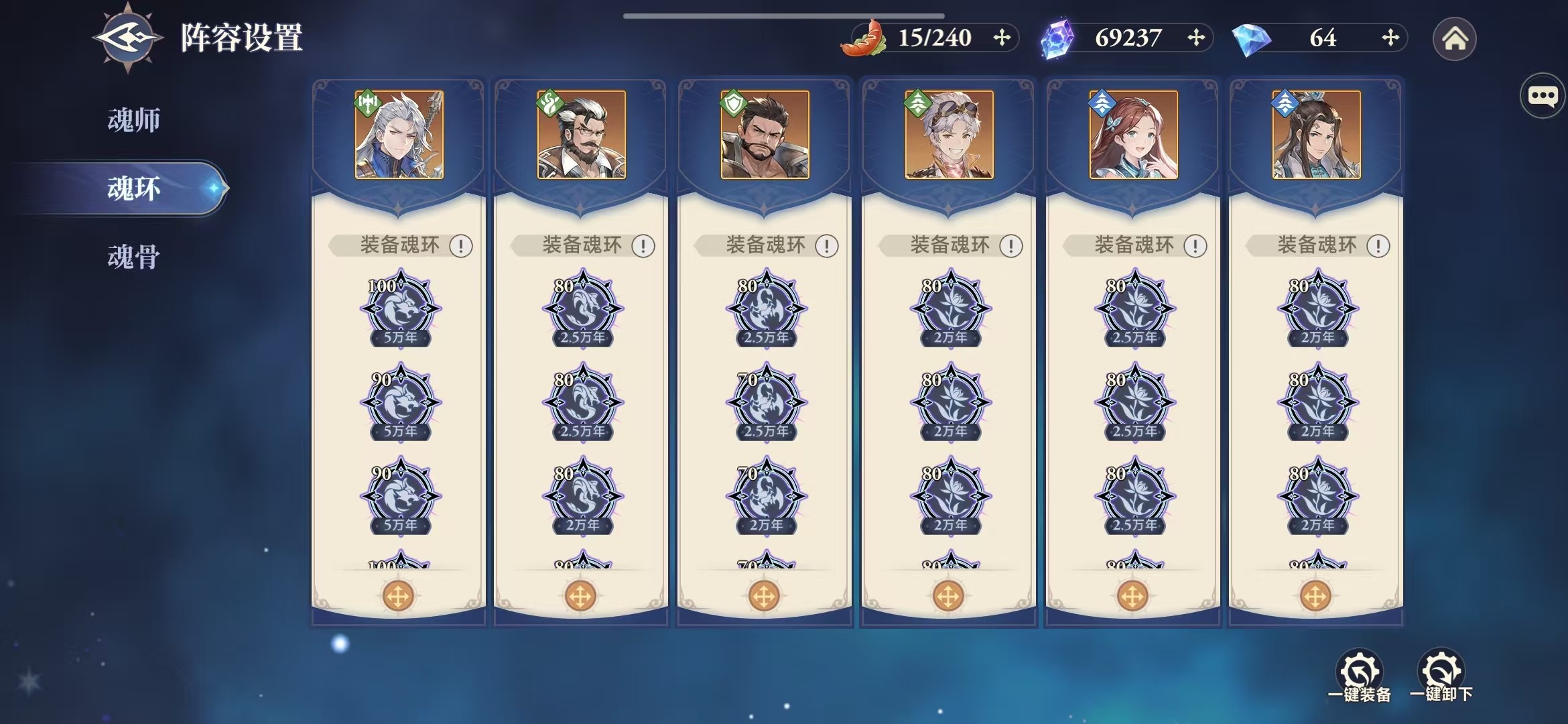 3.配好魂环魂骨。①魂环:零氪、微氪的剑道▪尘心等输出魂师练度不高,生存能力有限,如果站不住,建议第一、第四魂环装配甲盾系,其他都带猛兽系,保证能够持续输出。中氪、顶氪的输出魂师可以全部装配猛兽系,提高极限输出能力。