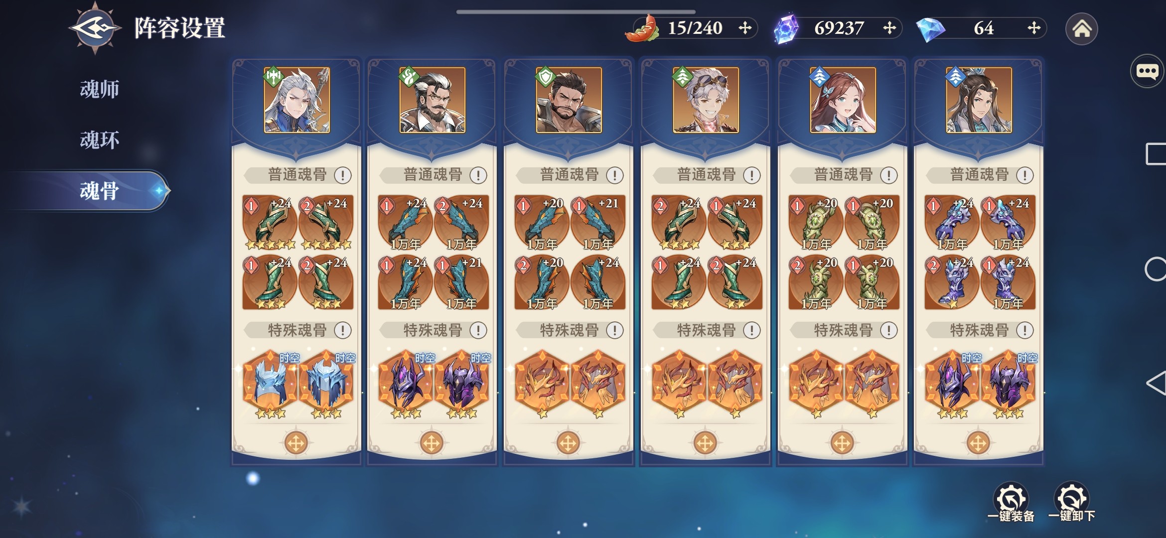 ②魂骨:输出魂师装配曼陀罗蛇,其他魂师以带鳞甲兽为主;时空魂师搭配时空外附魂骨—八角玄冰草、暗魔邪虎神,其他都选择烈火杏娇疏,能够最大限度的为全体提供增伤和减伤。