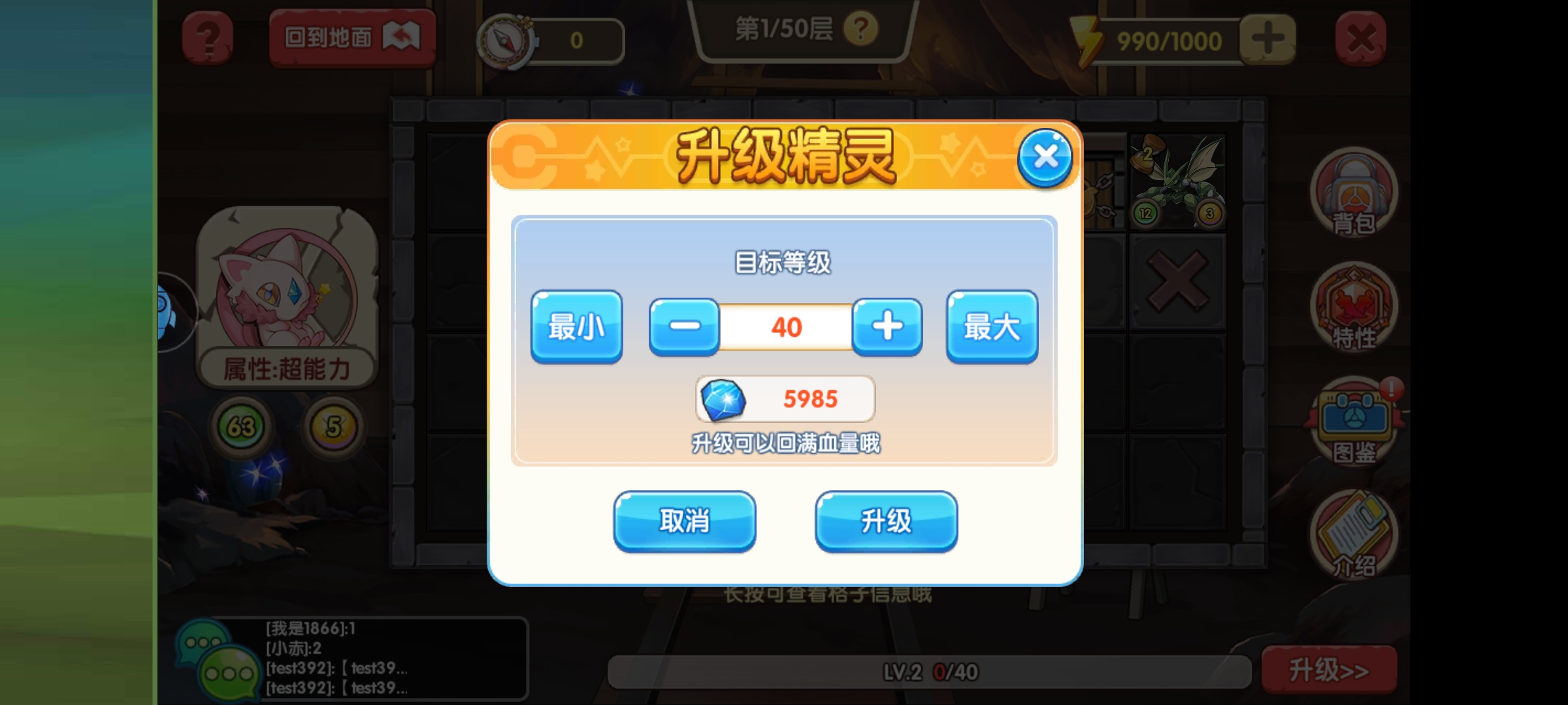 另外就是如果打不过,可以用钻石给精灵升级,升级过程血量和攻击值都会增加,这样面对怪物或者宝主都可以打,就是给氪佬准备的,让他们快速获得材料,平民如果不升级,只能等时间回复血量。