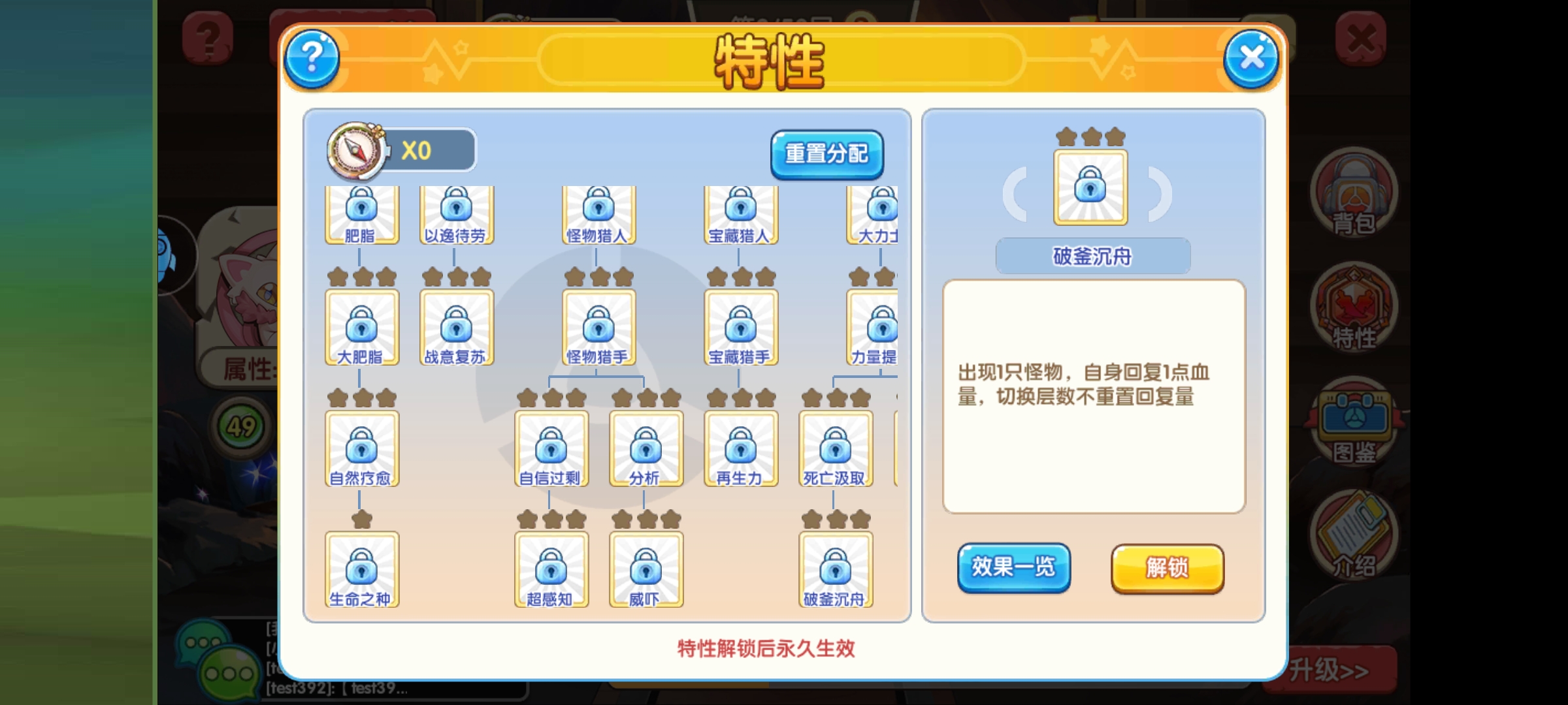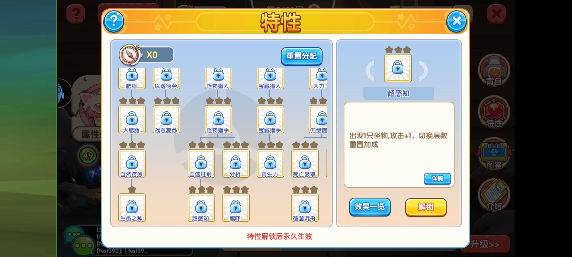 还有,自身也可以通过探索点解锁特性,上面是4个终极特性,我比较推荐生命之种,免费复活一次对平民来说很香。