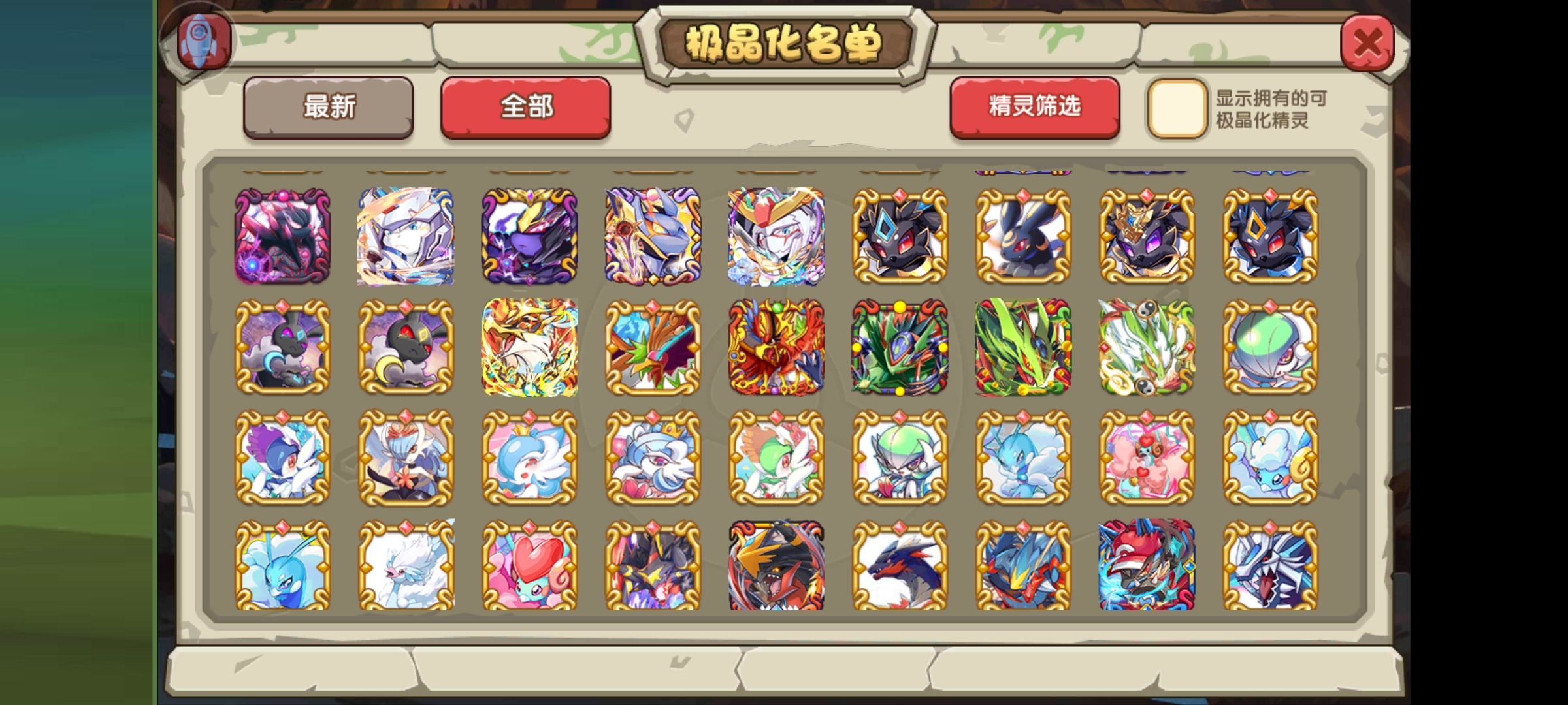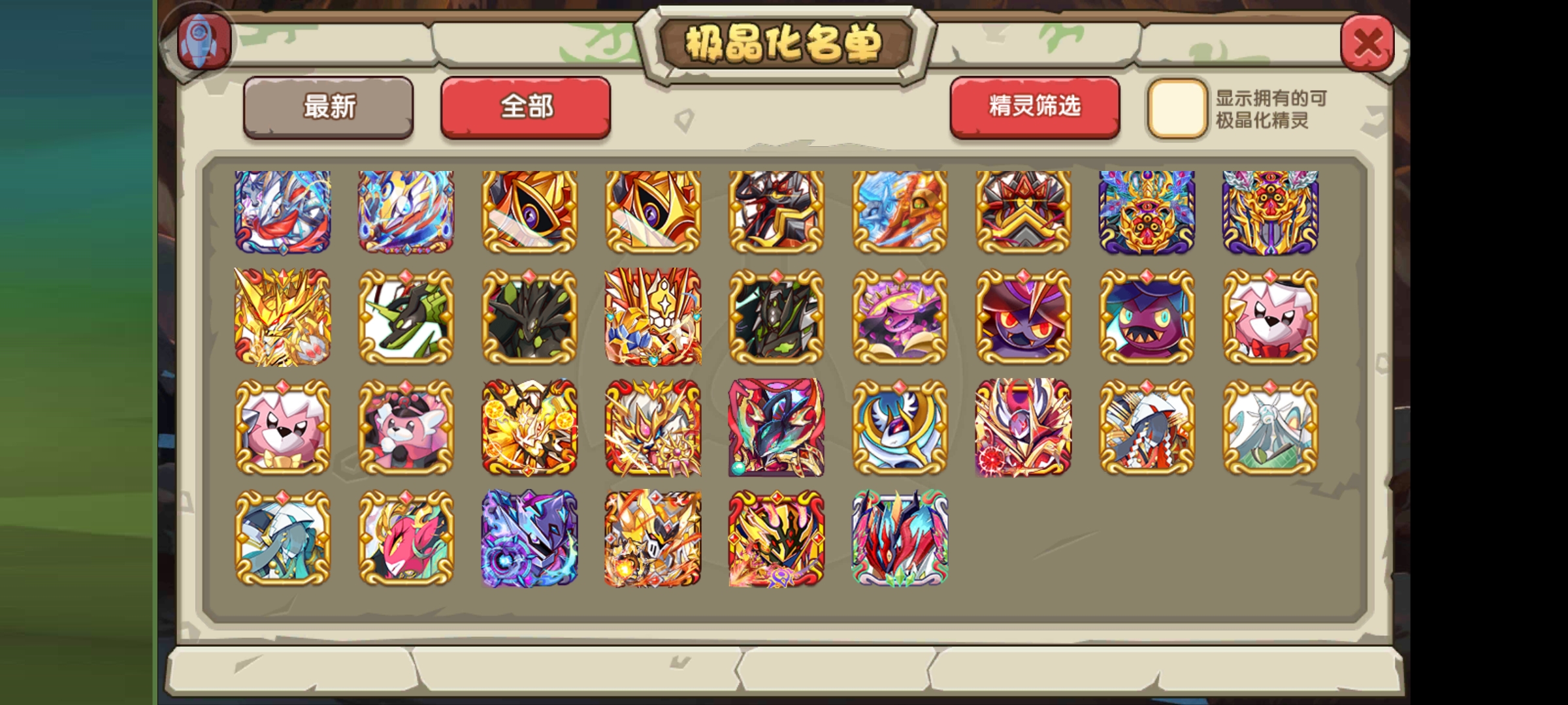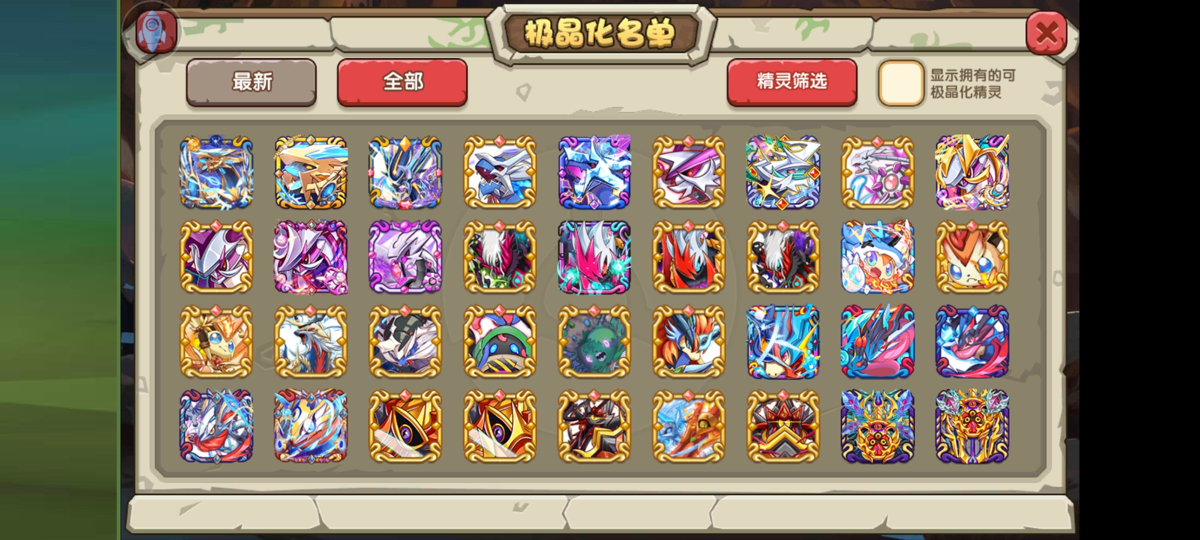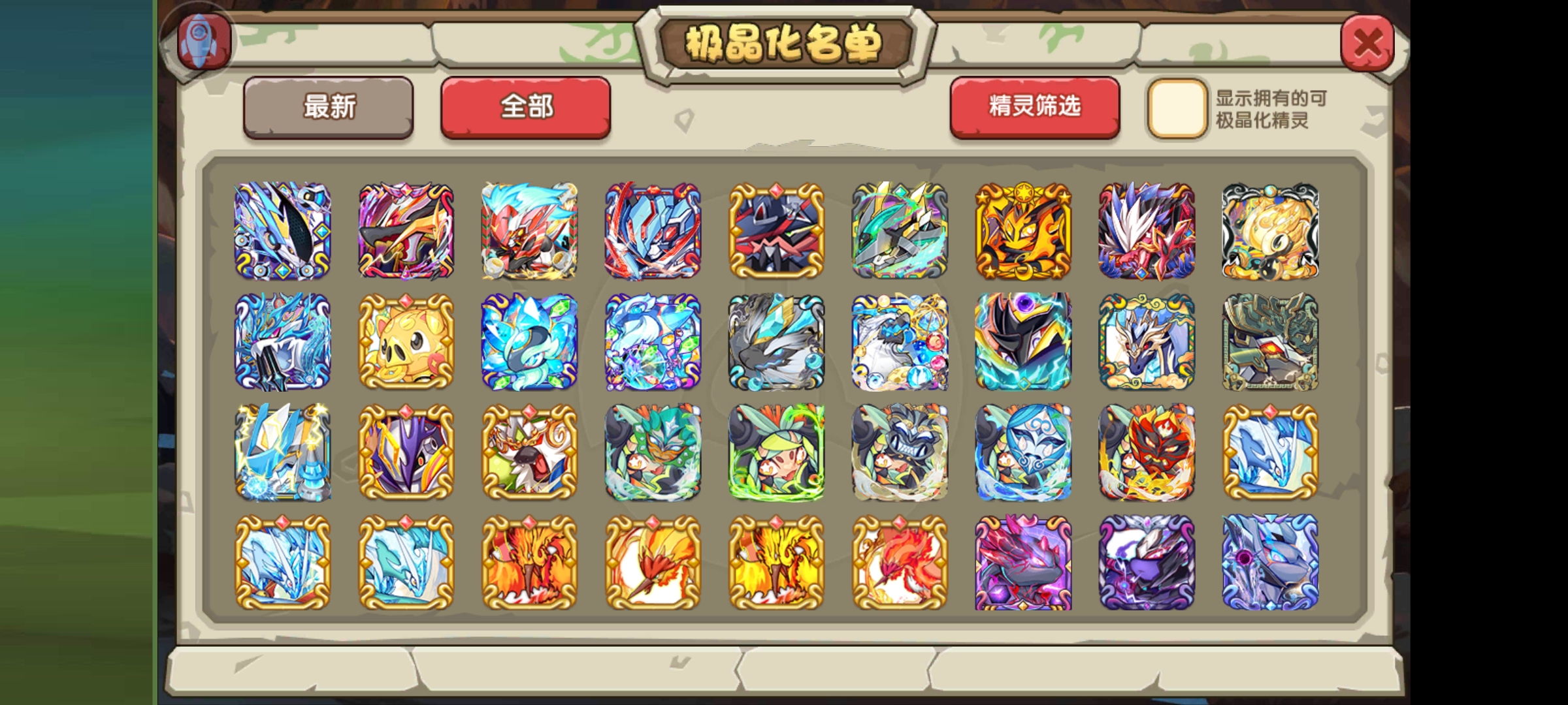 最后就是目前复刻开放的极晶化名单了,我图片放在下面了,大家可以看出很多是落伍宠,还有些是氪金宠,估计策划一方面怕给鬼蝉、异兽王这类特殊精灵开这个影响平衡,还是就是怕冷落了土豪。
