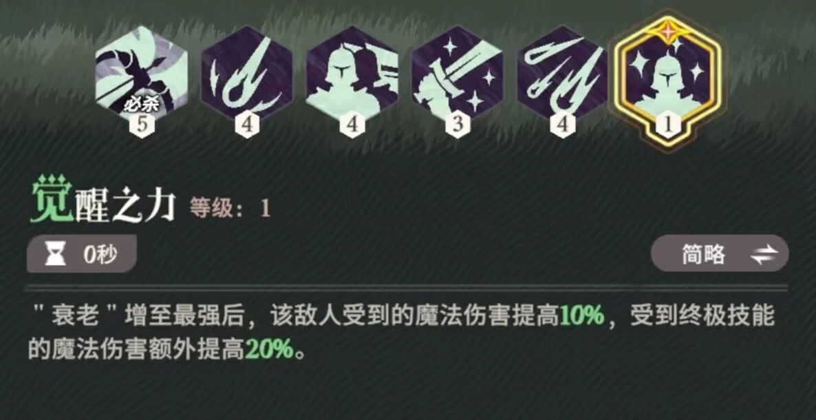 ⑤觉醒之力。衰老状态下的敌人会额外提升受到的魔法伤害,属于加强整个队伍的魔法伤害。