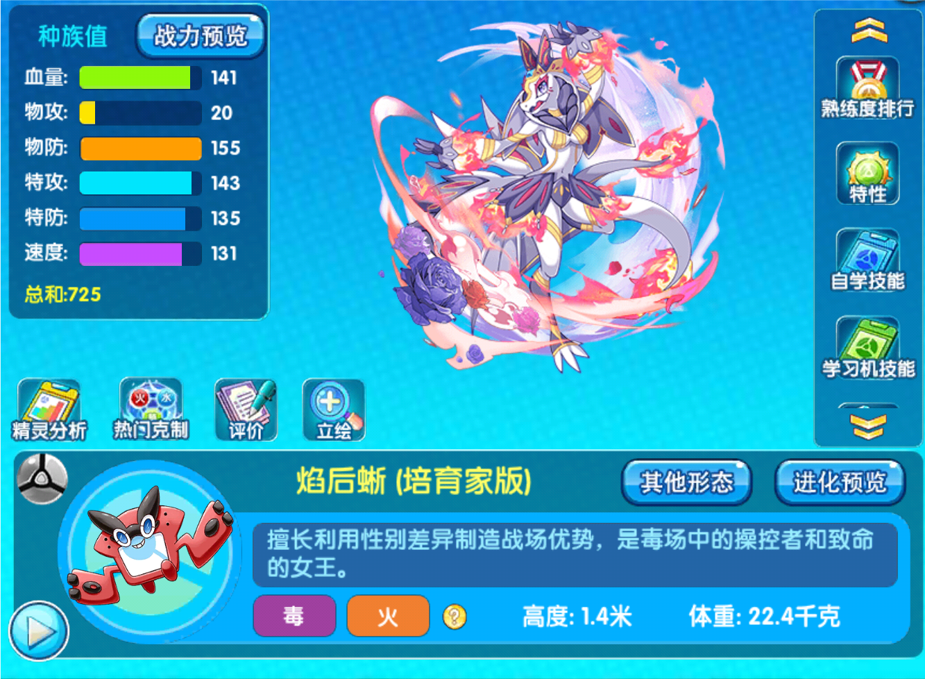 这一代培育家是给了整个游戏里面,我最想入手的一个精灵,之前的话是没有入手过的,虽然说是可以加形态,但是强度比之前的闪光形态是要高出不少,火蜥蜴这个形态从种族值来看的话,就像是一个面包属性一样,除了物理攻击比较低,其他的话基本上看起来都是比较均衡的,特别是血量和物防可以说非常的不错,可以当做个盾,还是挺好用的,速度的话比较快,像这种速度较快的辅助,基本上就可以完全的压制对方的辅助直接一个控制类技能,把对面控制的死死的,特防的话比物防稍低,所以说在战斗当中一定要注意,特别是面对特攻的地上技能。