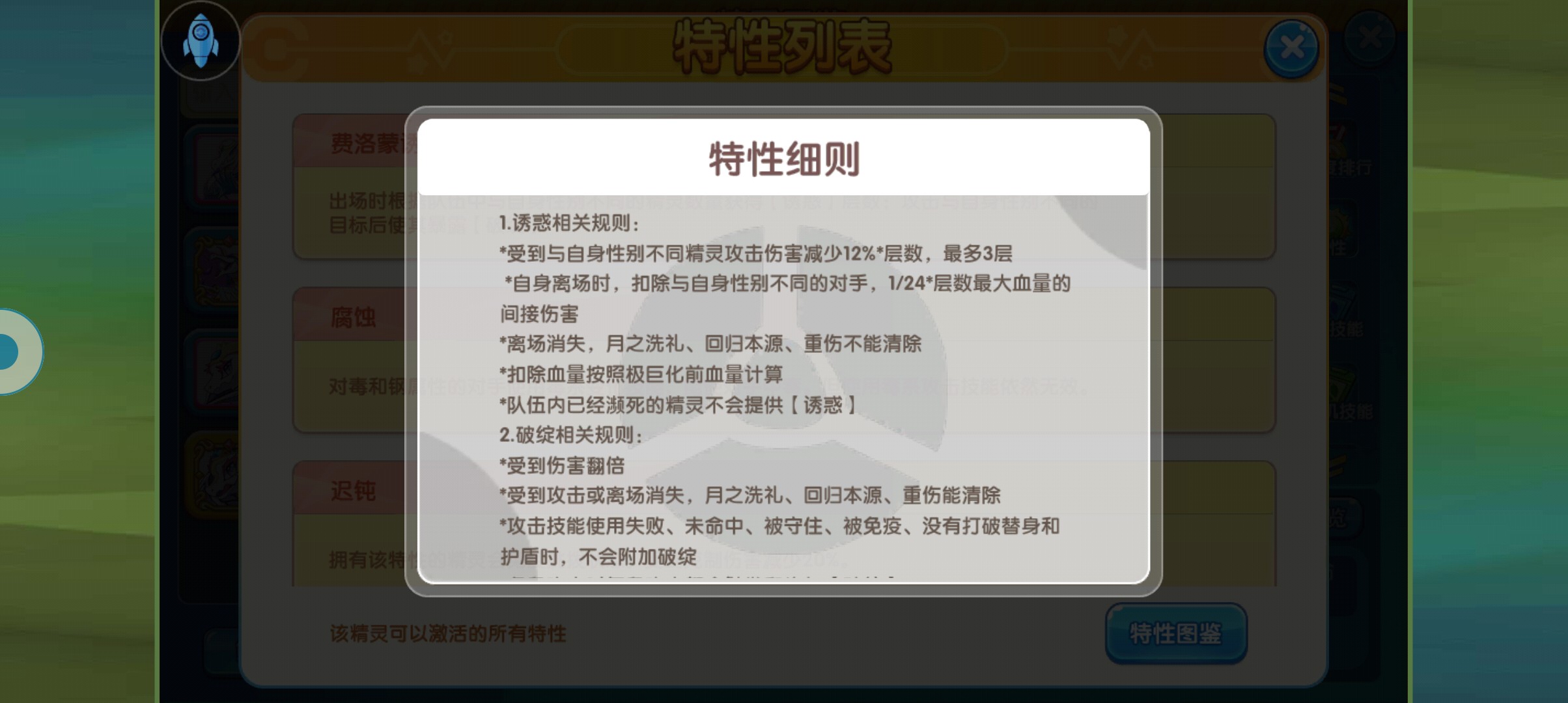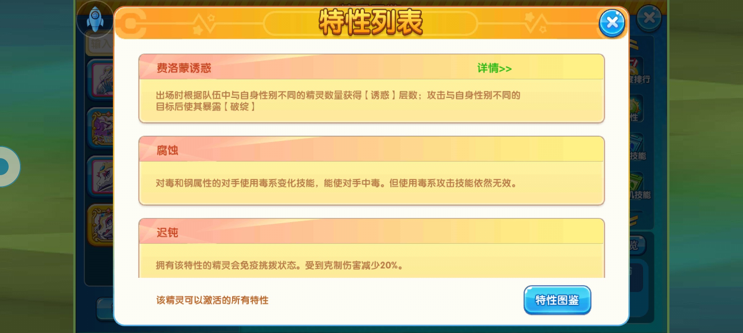 这个精灵的特性也是和游戏里面很冷门的一个机制有关系,那那就是性别,只要自身的背包队伍里面有性别和自身不同,那么自身就可以获得诱惑状态最多3层,处在该状态的精灵可以获得每一层12%的减伤,三层的话就是36%,远远超出现在精灵标准减伤30%,还要多6%,自身离场的时候还会给对方层数1/24的间接伤害,说白了,这个精灵和现在的鸣鸣差不多,就是离场的时候会给对方间接伤害,我估计这个机制应该就是下个游戏主推的机制了。