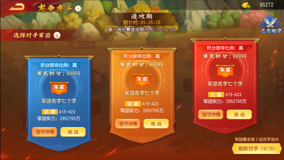 (3)仅军团长/副军团长可以选择对手进行挑战(界面显示低、中、高三名对手)