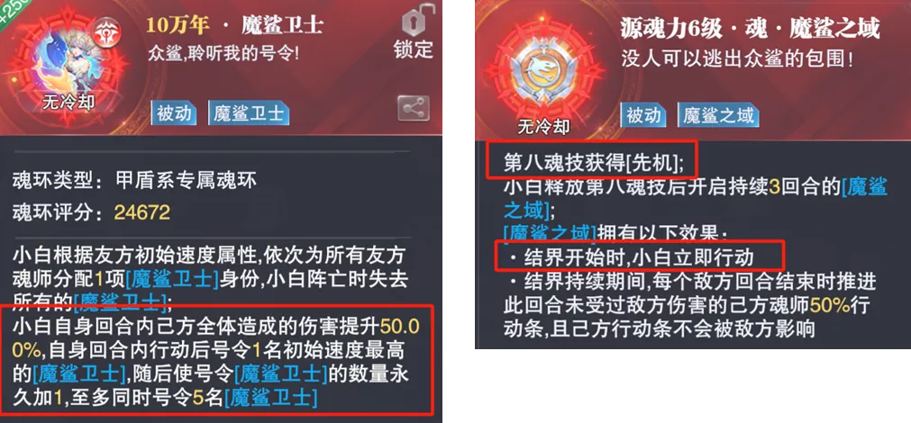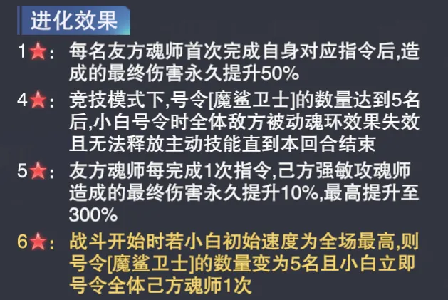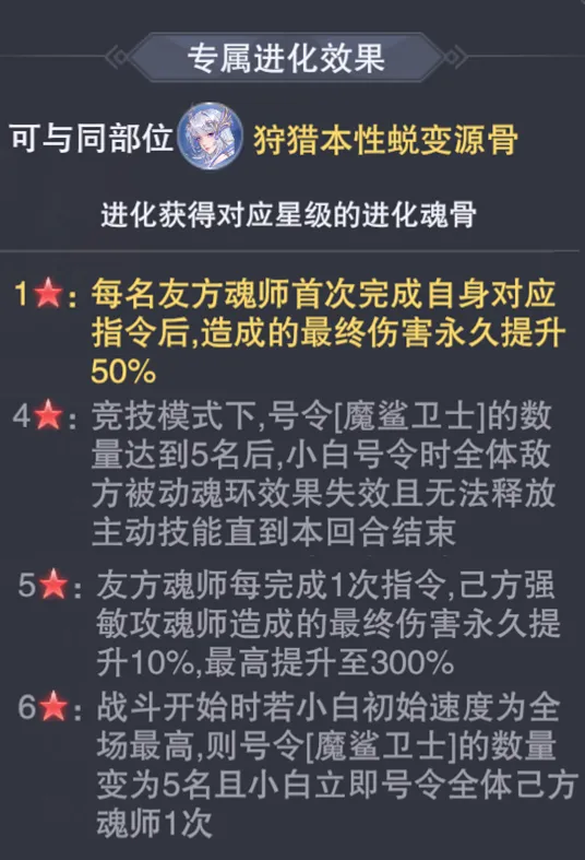 而SP小白的这款进化魂骨显然就是为了解决这个问题而设计的,开局如果速度全场最高,则可以直接号令5位友方触发不同鲨鱼的效果,且号令时对方的“被动魂环”失效且无法是放主动技能至本回合结束。